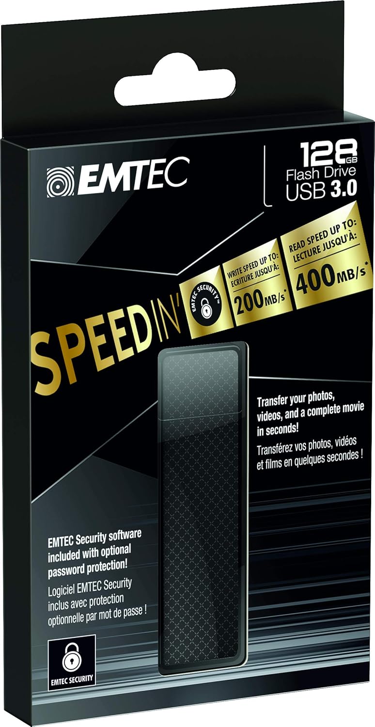 S600 SpeedIN 3.1The highest performing EMTEC USB flash drive !This SPEEDIN’ USB Flash Drive from EMTEC with MLC memory provides incredible performance.EMTEC SecurityWith EMTEC Security, your private files are always protected! Secure your private files and improve their confidentiality with the EMTEC Security lock system included with the external SSD X600 SpeedIN, USB S600 SpeedIN, and Click Fast. This is an optional password protection.Thanks to this “stand-alone” application program, you can create a secured partition on your flash drive or external SSD. You configure the size of the secured and the public partition.