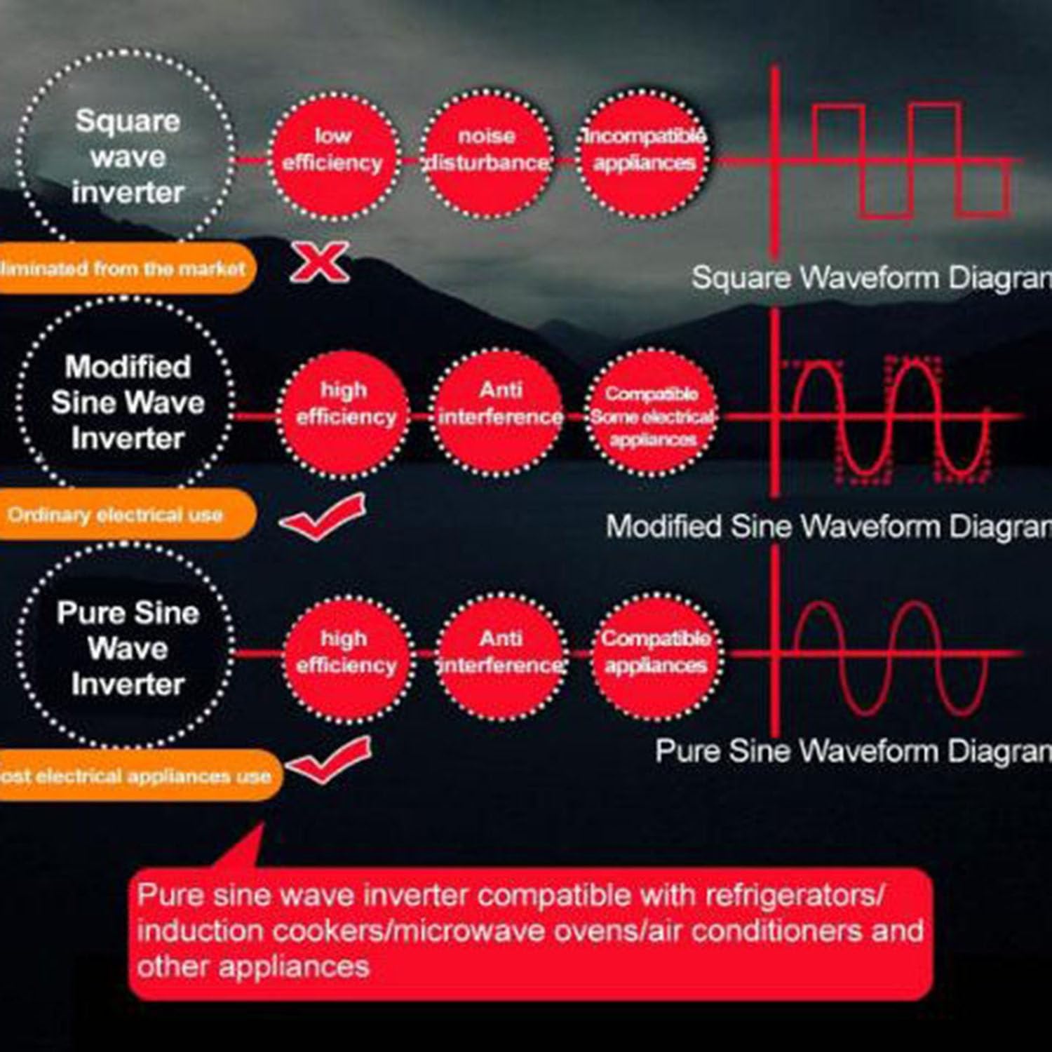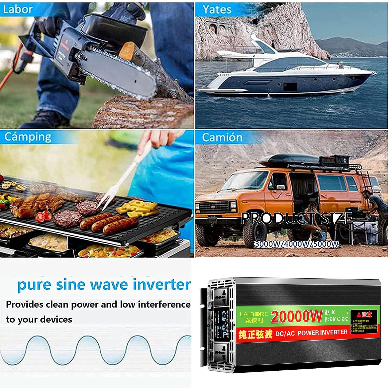 Pure Sine Wave Inverter: This versatile Car Inverter Converter utilizes Pure Sine Wave Technology, ensuring low noise and minimal interference. It converts 12V, 24V, 48V, 60V, and 72V DC into 110V-120V or 220V-240V AC, making it ideal for Emergencies, Camping, and Home Use. Perfect for RVs and Solar Energy applications. Choose the inverter that matches your battery voltage for optimal performance.