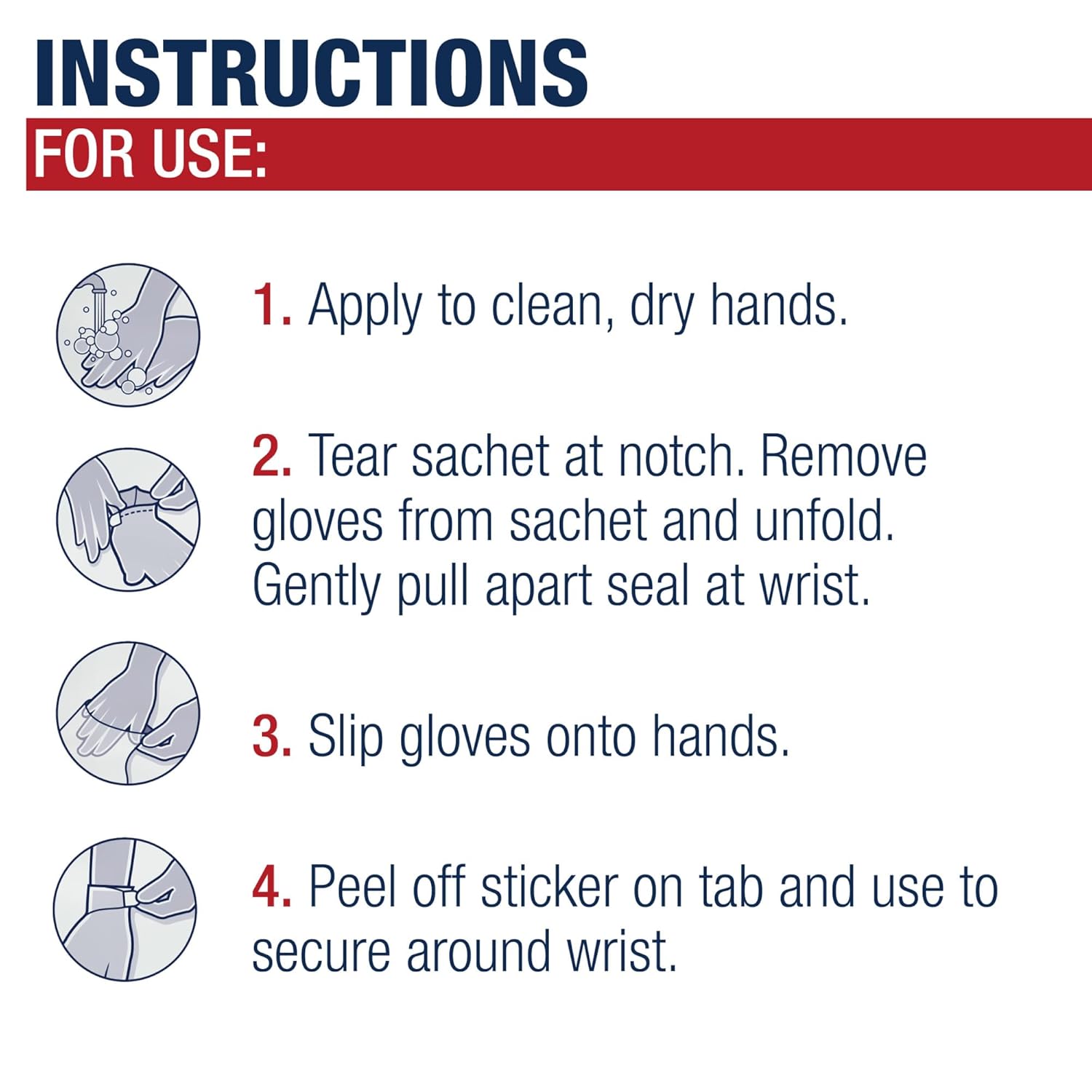 EASY APPLICATION: Apply to clean, dry hands for at least 10 minutes (tear sachet at notch, remove from sachet and unfold, pull apart seal at wrist and slip onto hands)