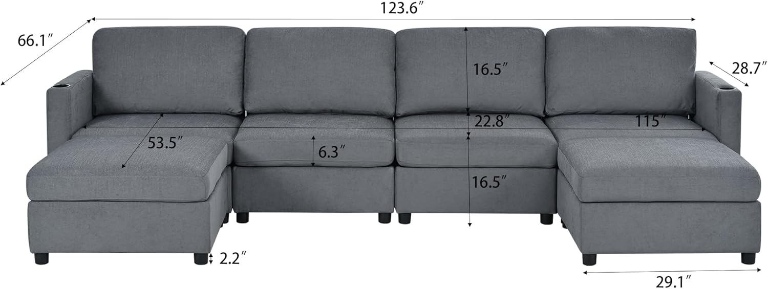 【Large Storage Space】 The 4-seat section of this sofa sectional features 2 double seats with generous storage compartments, while all ottomans provide additional space for larger items. This thoughtful design helps maintain a clutter-free environment, whether you’re hosting a lively game night or enjoying a quiet evening in. Simply pull the strap and lift the cushion lid to access your belongings easily.