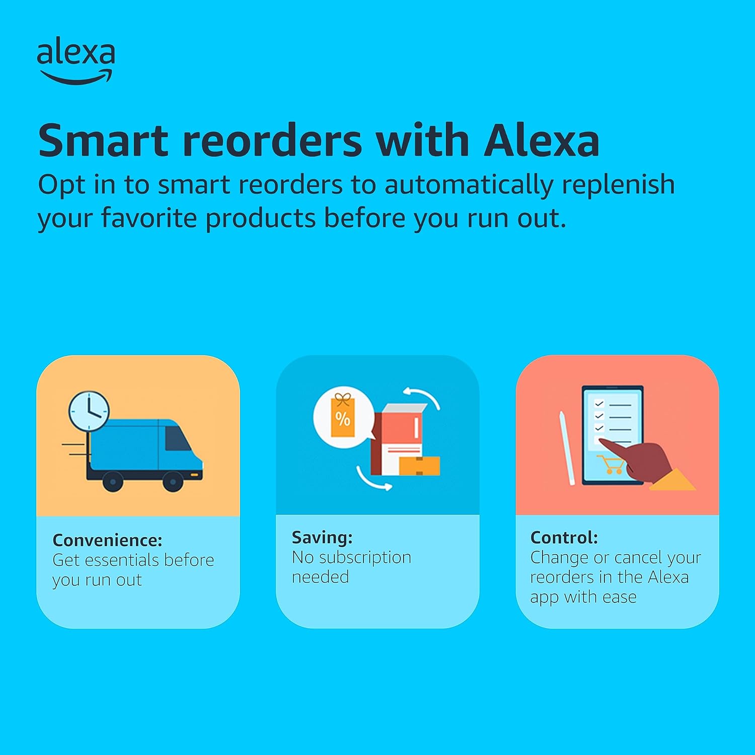 Enrolling in Smart Reorders with Alexa ensures that you never have too much or too little ink supplies. No subscription needed.