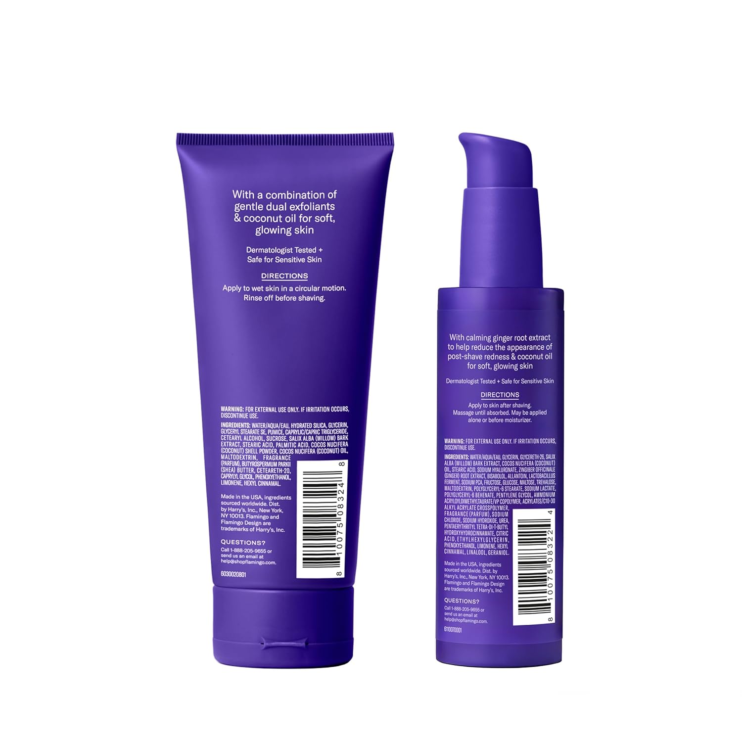 Give your shave a glow up with these pre- and post-shave solutions for soft, glowing skin. Prep for a close shave with Smoothing Shave Prep Scrub, a dynamic combo of chemical and physical exfoliants like BHA and crushed coconut shell work to smooth skin, while coconut oil leaves it soft and glowing. Finish with Soothing Post Shave Serum to hydrate skin and help reduce the appearance of post-shave redness. Hyaluronic acid hydrates, calming ginger root extract helps reduce the appearance of post-shave redness, and coconut oil leaves skin soft and glowing. Flamingo Shave Prep Scrub and Post Shave Serum are both dermatologist-tested and safe for sensitive skin. Add our Nourishing Shave Oil and any Flamingo women’s razor for your best shave.