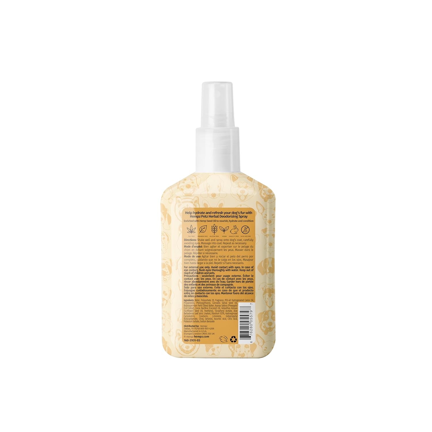 Keep your dog smelling fresh and clean throughout the day with the NEW Petz Pineapple & Coconut Gentle Herbal Deodorizing Spray. Enriched with 100% hemp seed oil to help nourish and hydrate your pup’s coat. 8.5 ounces in a spray bottle.