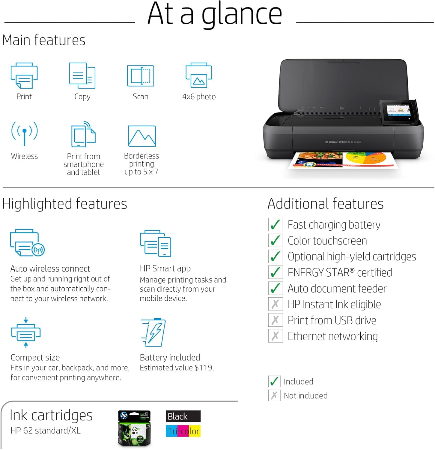 PRINT THE MOST—ANYWHERE – This printer uses Original HP 62 series cartridges that deliver the highest in-class page yields, allowing you to print longer in between supply replacements