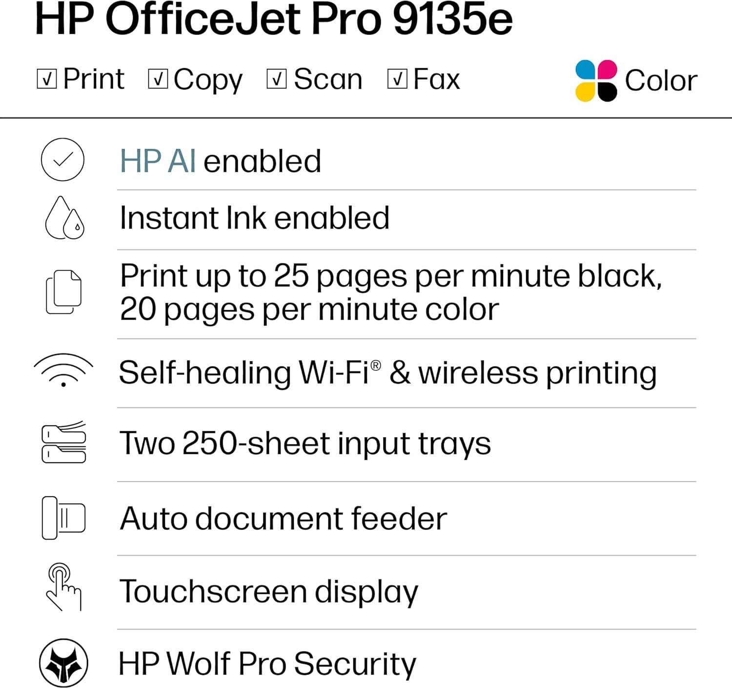 The OfficeJet Pro 9135e is perfect for offices printing professional-quality color documents like presentations, brochures and flyers. Print speeds up to 20 ppm color, 25 ppm black