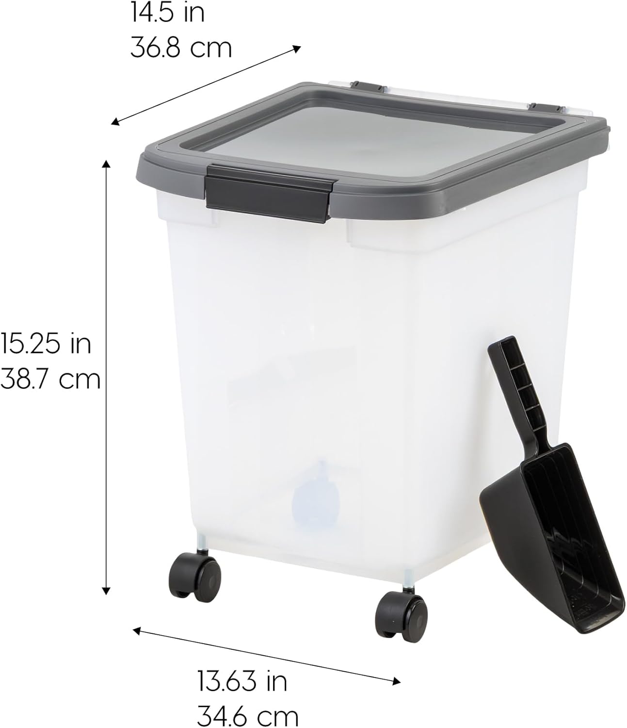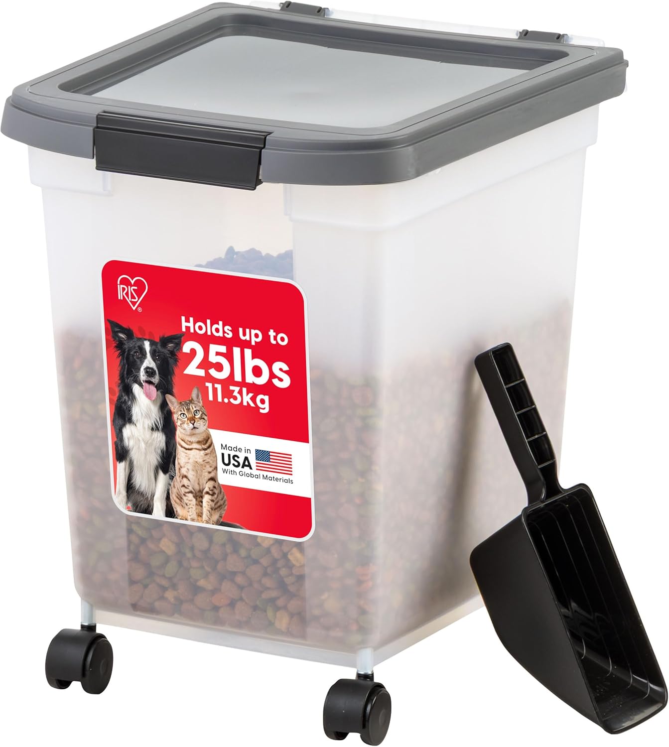 IRIS USA Airtight Dog Food Storage Container 25 lbs, Removable Wheels, for Dog Cat Bird and Other Pets, Food Storage Bin, Keep Fresh, Made in USA, Clear/Dark Gray