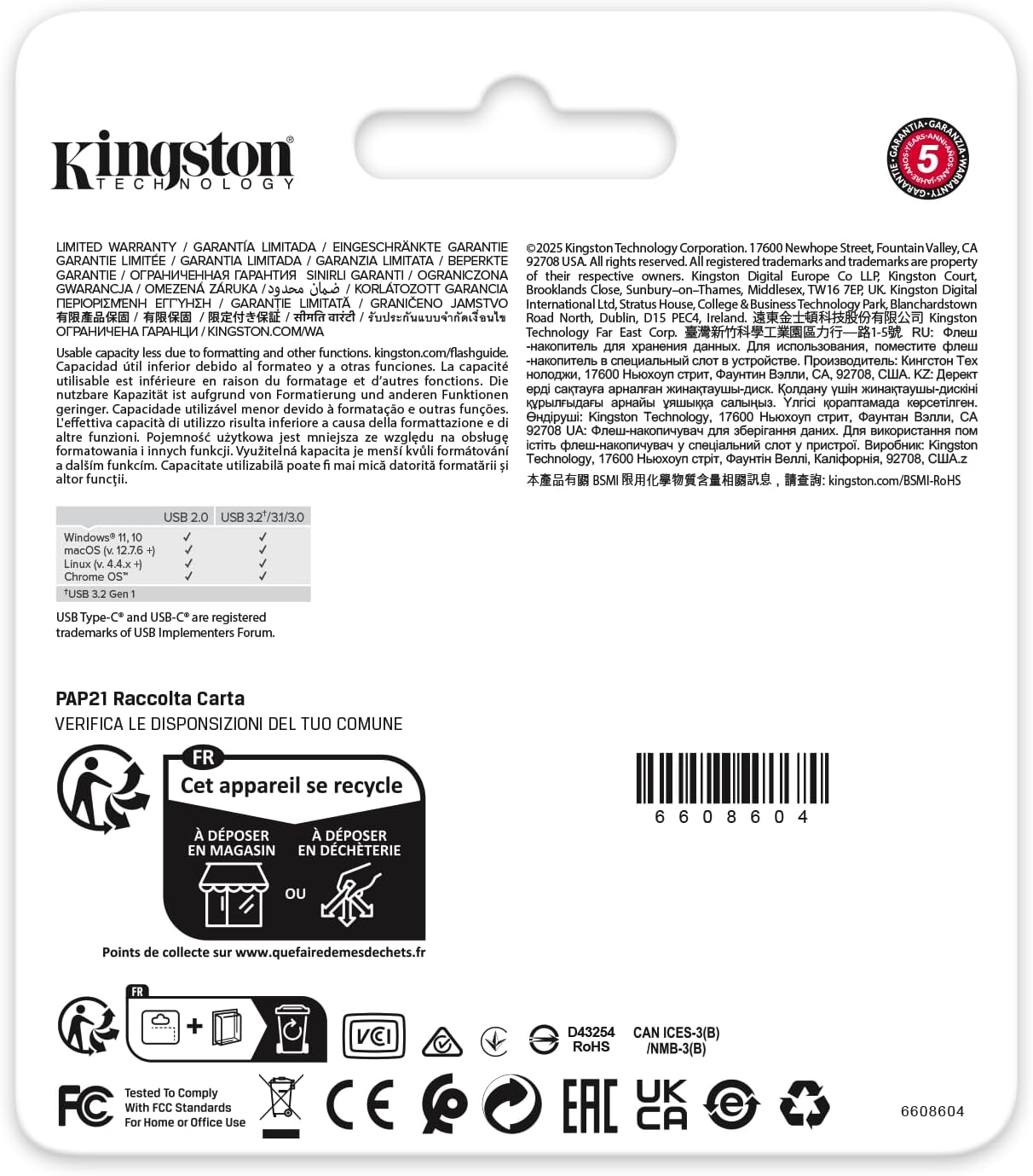 Kingston® DataTraveler® Duo features dual USB connectors that work with both USB Type-A and USB Type-C®* ports for maximum compatibility. The innovative dual moving cap design makes the drive stylish and convenient, with no cap to lose. With capacities up to 256GB**, you can easily access and transfer documents, photos, videos, music and more between your USB-A and USB-C devices with the DT Duo. The product is backed by a five-year limited warranty, free technical support and legendary Kingston® reliability.