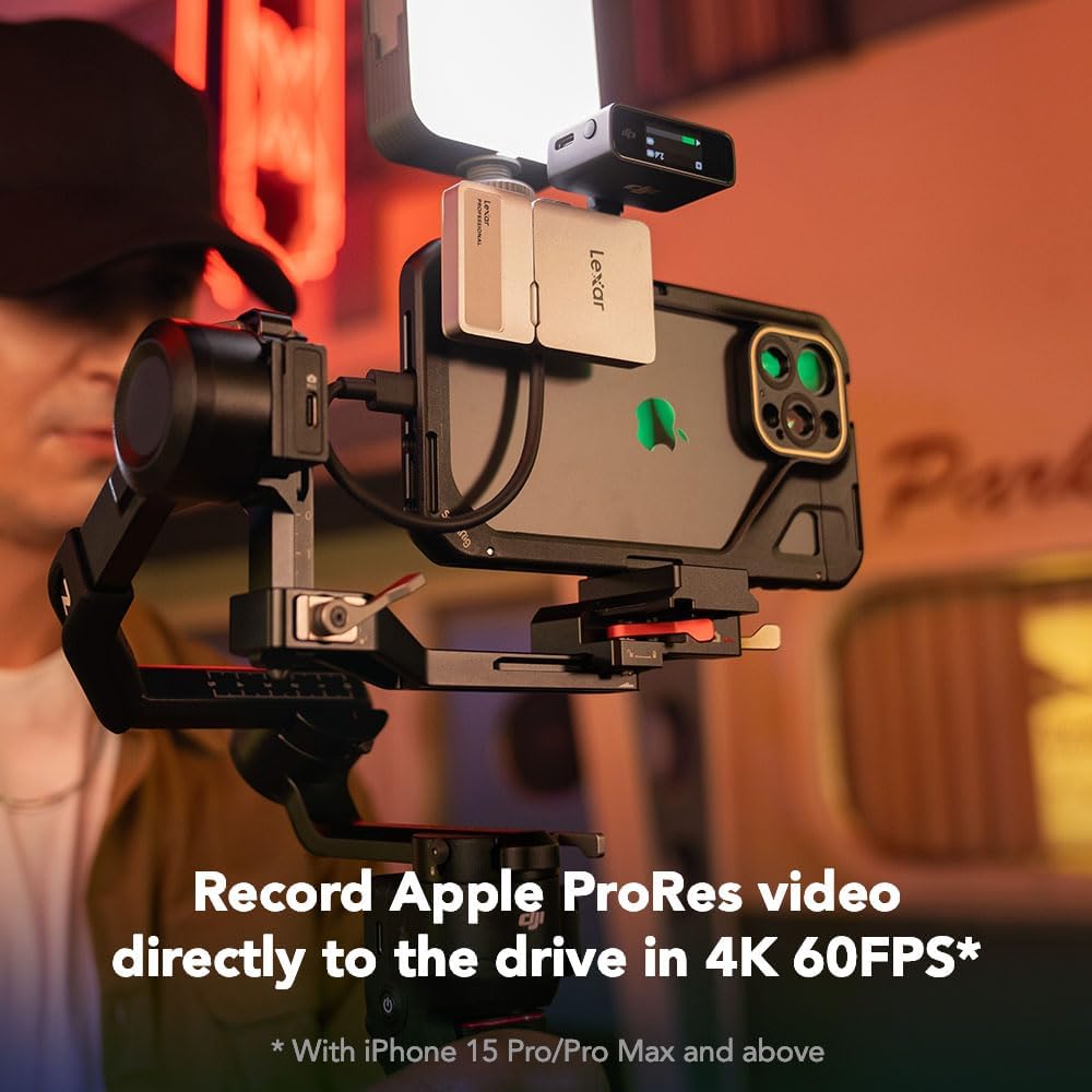 The ultimate setup to shoot seamless video from your mobile phone, the innovative Lexar Professional Go Portable SSD with Hub is a revolutionary solution that lets you use the SSD on its own for unmatched freedom and portability or with the hub to add peripherals like lighting, microphones, power banks, and more. Weighing a mere 13 grams but packing a capacity of 1TB-2TB, the powerful SSD delivers USB 3.2 Gen 2 performance of 1050MB/s read, 1000MB/s write to shoot seamless ProRes 4K 60 fps video from your iPhone 15 Pro/Max or above and perform post-production processes right on the drive.
