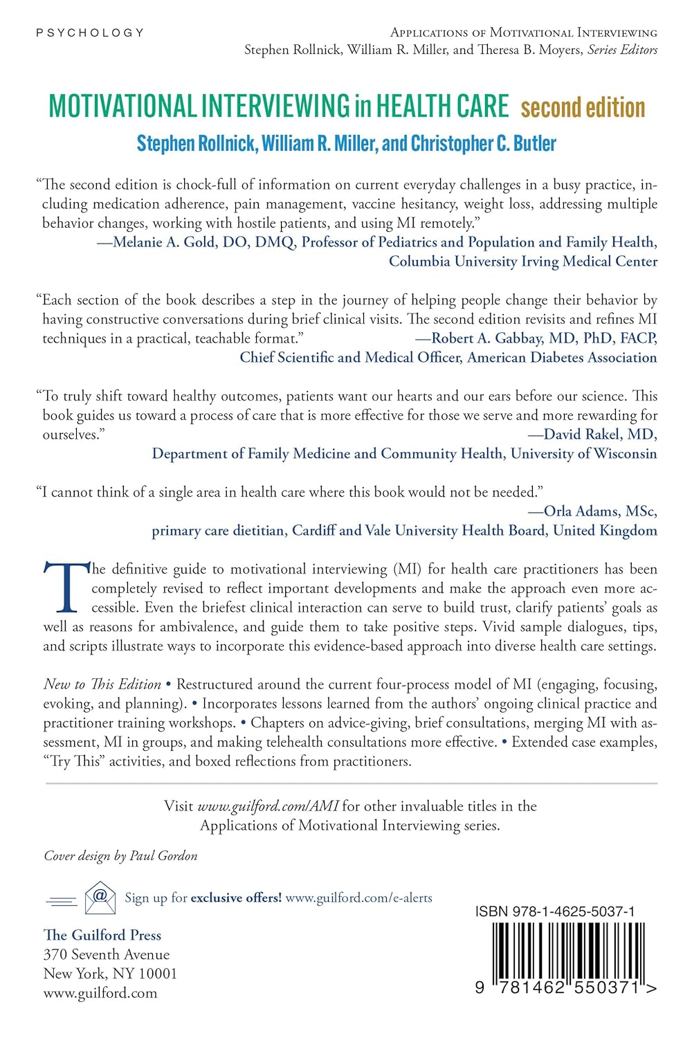 The definitive guide to motivational interviewing (MI) for health care practitioners has been completely revised to reflect important developments and make the approach even more accessible. When it comes to helping patients manage chronic and acute conditions and make healthier choices in such areas as medication adherence, smoking, diet, and preventive care, good advice alone is not enough. This indispensable book shows how to use MI techniques to transform conversations about change. Even the briefest clinical interaction can serve to build trust, clarify patients’ goals as well as reasons for ambivalence, and guide them to take positive steps. Vivid sample dialogues, tips, and scripts illustrate ways to incorporate this evidence-based approach into diverse health care settings.