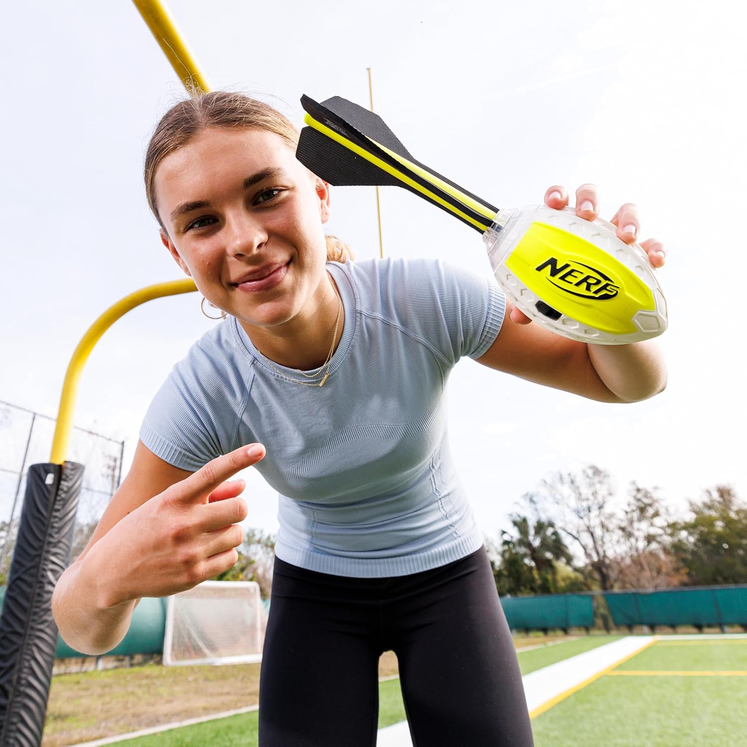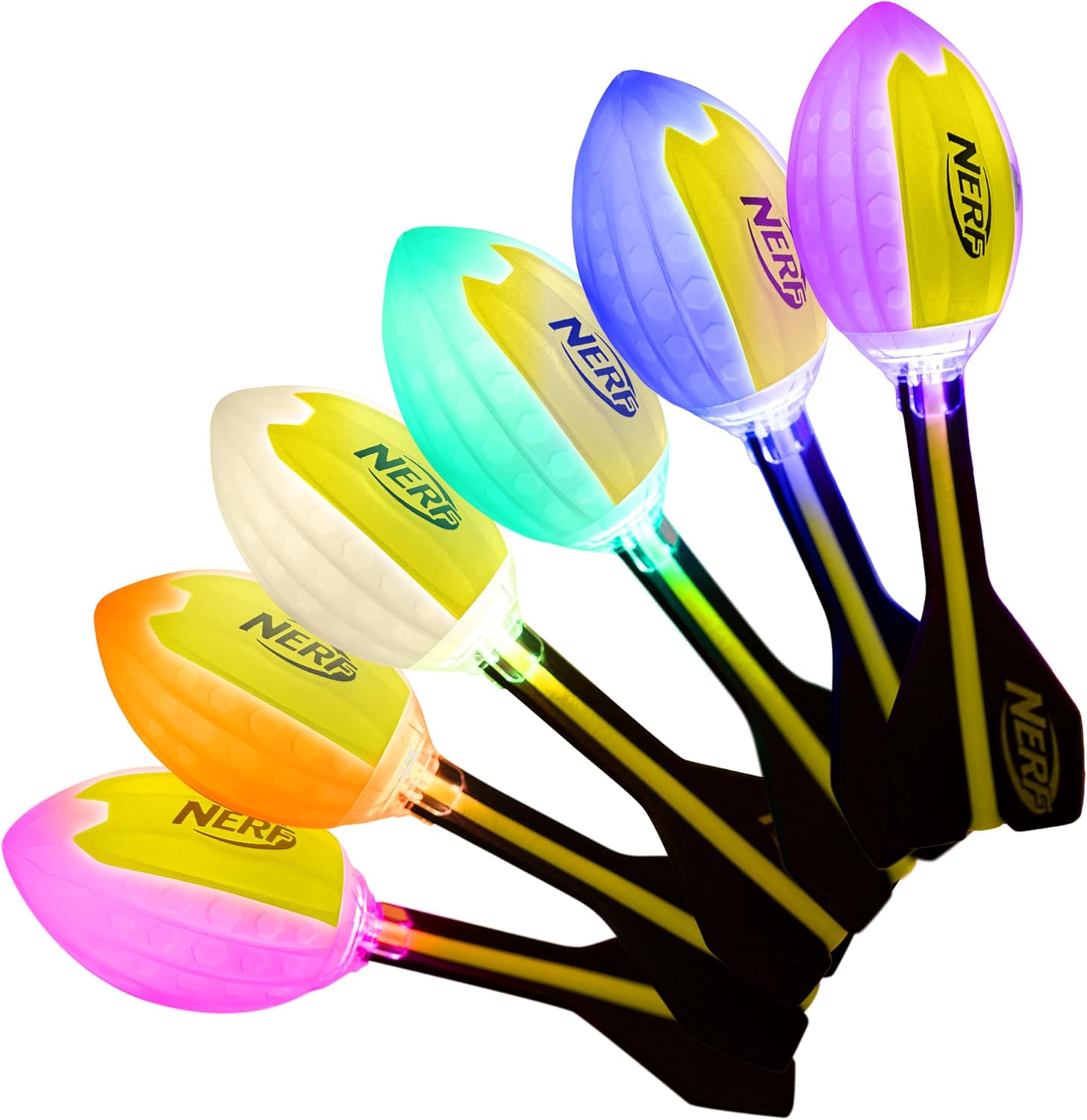 Go deep and go dark with some killer passes with the Nerf Lightstrike Vortex Football! This impact activated LED football illuminates from the inside with a tap and automatically shuts off when not in use. The color changing technology lets you light up the night with red, green and more! Not only see the difference but hear it with the built in whistles! Play indoors or outdoors, the Nerf Lightstrike Vortex football is the best way to bring extreme flying action to any game at any time!