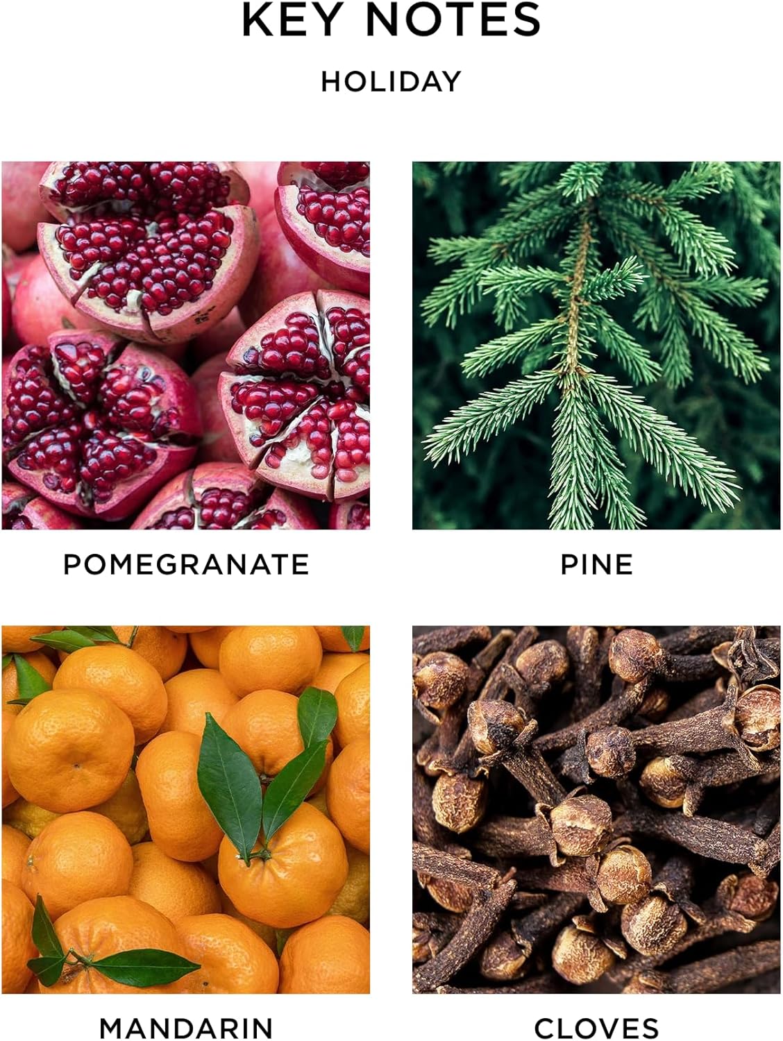 CITRUS & WOODY – Pomegranate, mandarin orange, pine, cloves, and cinnamon blend with a hint of vanilla and amber in this sophisticated fragrance, instantly providing the aroma of a sparkling holiday season.