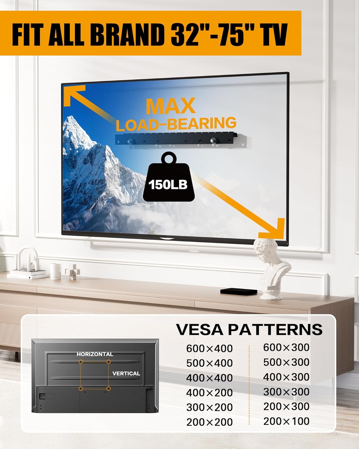 【Studless TV Mount for 32–75 Inch TVs】HYPIGO studless TV wall mount fits most 32–75 inch flat or curved TVs with VESA patterns 200×100mm to 600×400mm. Works with Samsung, LG, Sony, TCL, Vizio, Hisense, and more—ideal for upgrading large screens without wall damage