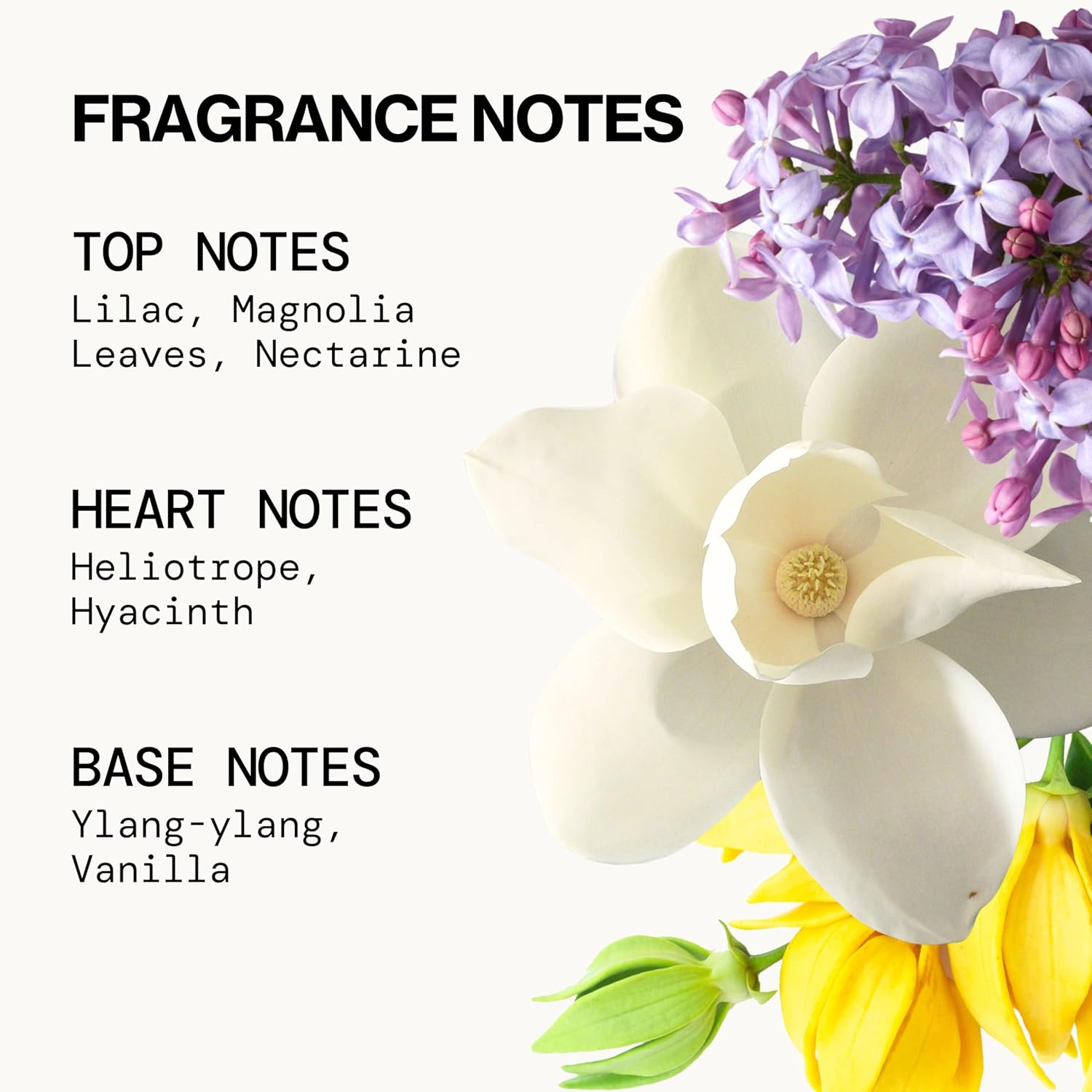 This fresh scent conjures spring with a blend of lilac, magnolia leaves, heliotrope, ylang-ylang, hyacinth and subtle notes of nectarine