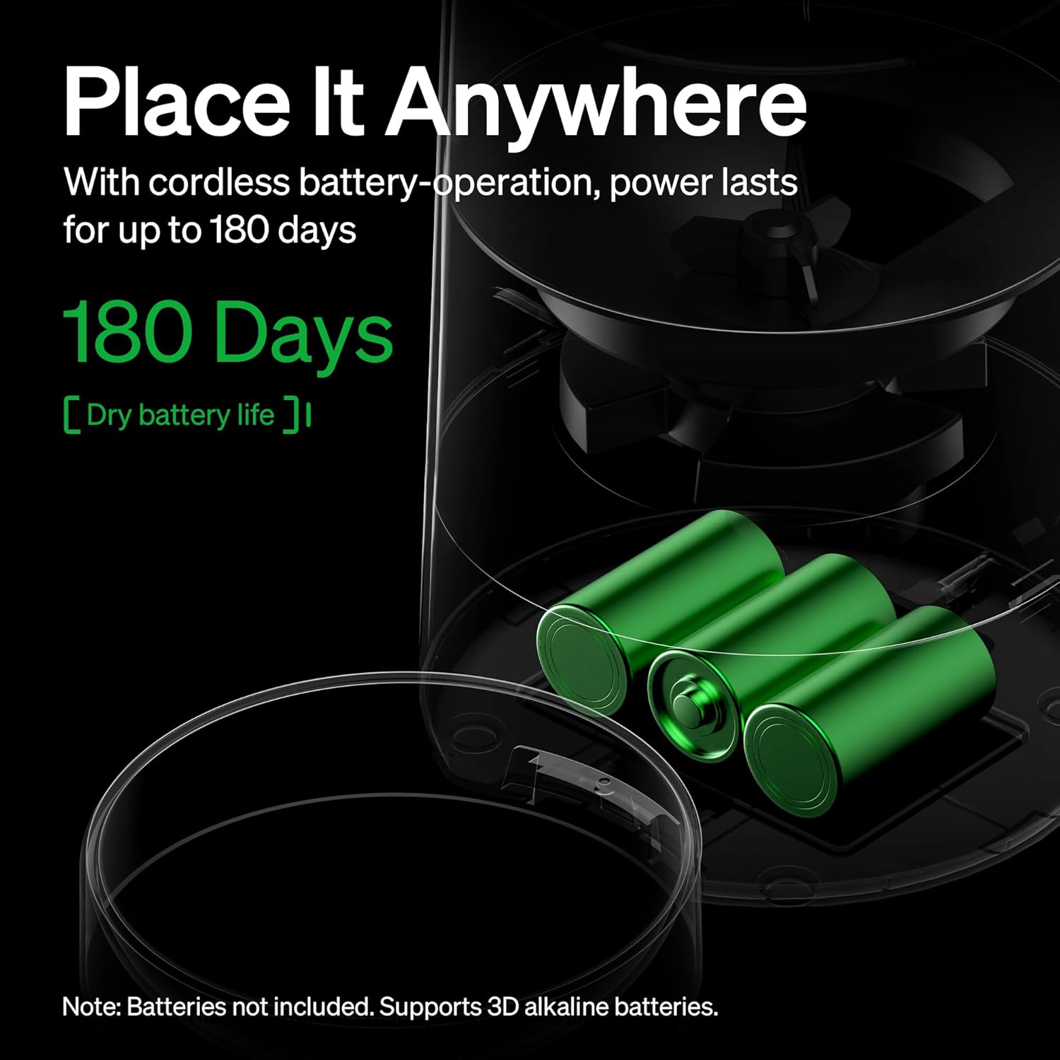 Flexible Placement – The PETLIBRO Air automatic cat food dispenser offers two power options (battery or power cord). If you choose to use batteries as the main power source, three D alkaline batteries can provide up to 180 days of battery life, allowing you to place it wherever you want without being limited by electrical outlets. (Batteries not included, please search for B00000JHQE and B000JCCT9Y directly on Amazon)