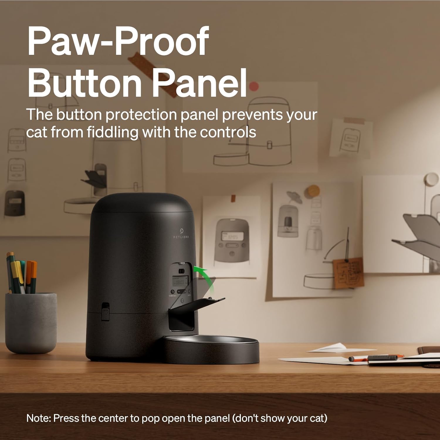 Prevents Unintended Button Presses – The button protection panel on the battery-operated timed cat feeder not only gives the feeder a sleek and simple appearance, but also protects the operational buttons from accidental presses, thus ensuring every meal arrives as intended. To use the panel, simply press at the center to open it.