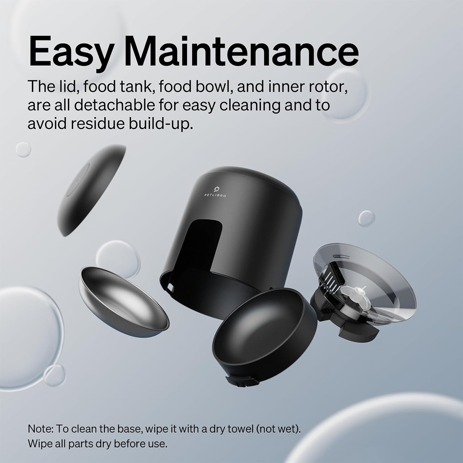 Easy to Disassemble and Clean – The cordless automatic pet feeder’s top lid, food tank, internal rotor, and stainless steel food bowl, are all easily detachable to make disassembly easy and effortless. This makes it convenient to clean every corner of the feeder for optimal pet health and hygiene. Please note that the feeder base can not be washed with water, and should only be wiped with a dry cloth if cleaning is necessary.