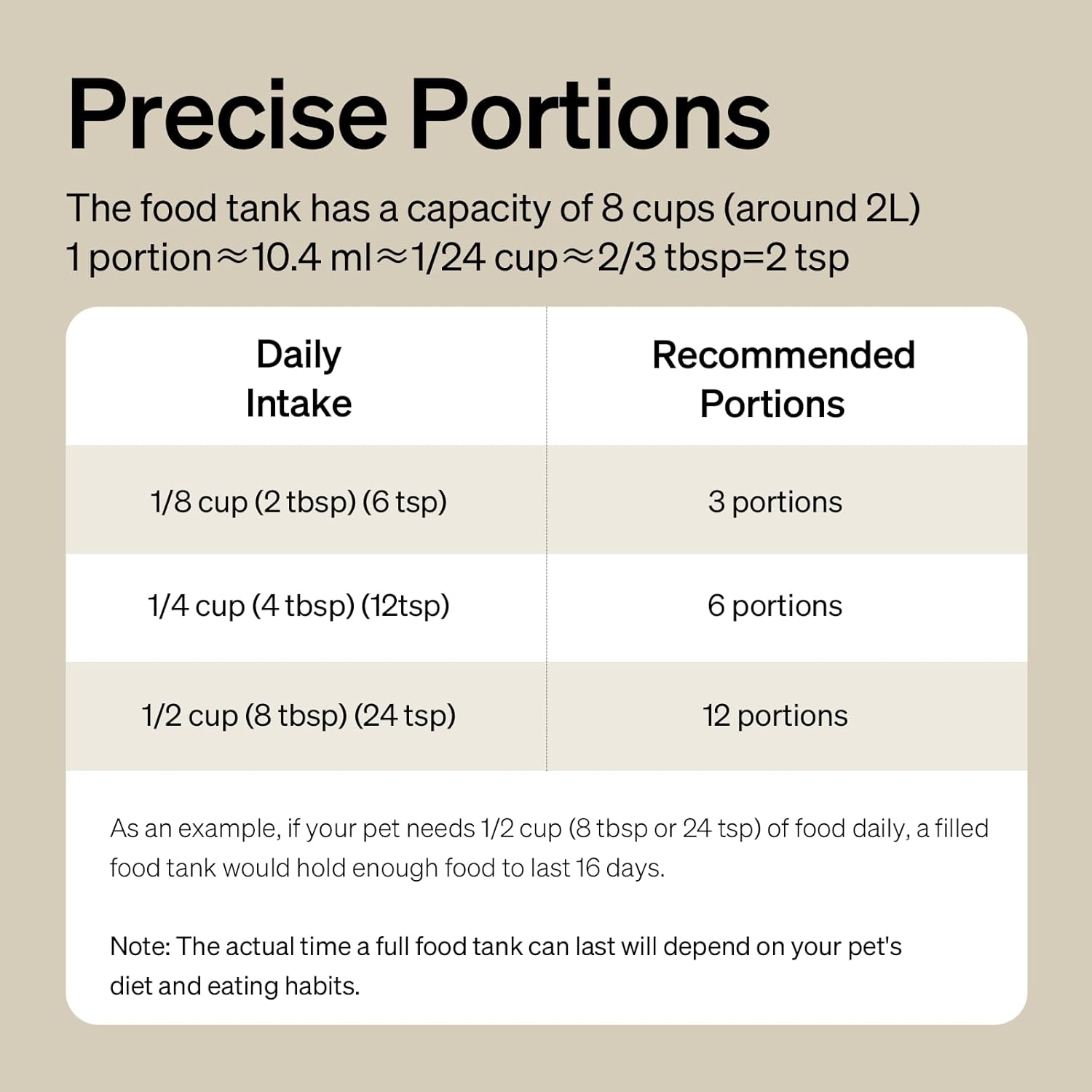 Automatic Feeding Schedule – The PETLIBRO automatic cat feeder can support up to 6 meals per day, with 1-16 portions of food per meal. Easily set the feeding schedule that suits your pet’s needs and make their eating habits more regular and healthy. (1 portion≈ 10.4ml ≈ 1/24 cup ≈ 2/3 tbsp ≈ 2 tsp, food portions may vary based on size, type, etc.)