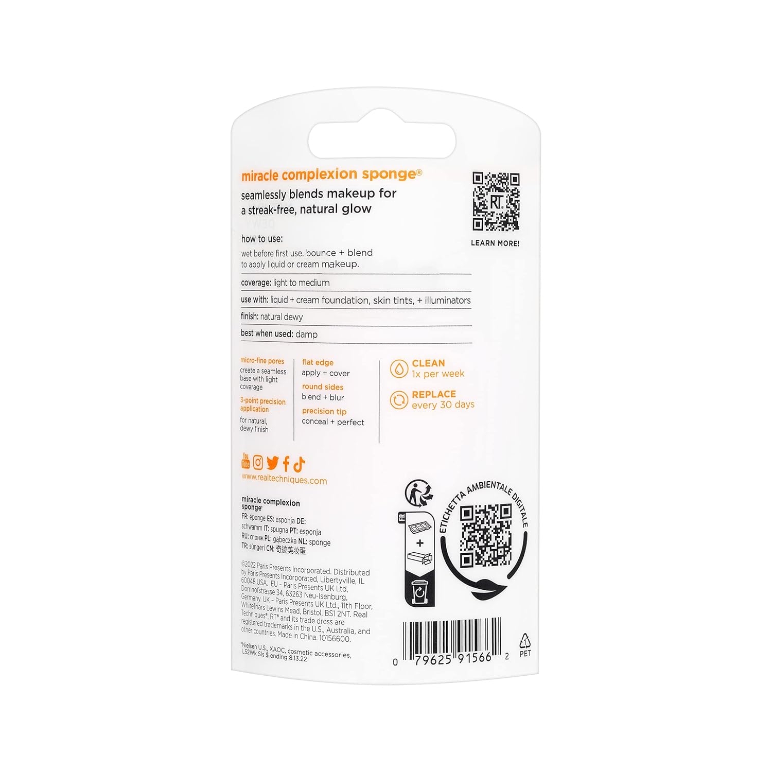 The Real Techniques Miracle Complexion Sponge flawlessly blends liquid and cream products with ease for a streak-free, luminous glow. Our best-selling makeup blending sponge offers a natural, dewy finish, and its micro-fine pores help create a seamless base with light to medium coverage. Real Technique’s makeup sponge works best with liquid and cream makeup products such as foundation, skin tints, and illuminators. This makeup sponge has RT’s unique 3-point application technique that makes blending products seamless. First use the flat edge of the makeup blender sponge to pack on product, then the precision tip to conceal, and finally, blend it all out with the rounded side. Use it damp for extra dewiness and let that inner glow shine through. The Miracle Complexion Sponge is easy to clean using our Real Techniques Brush + Sponge Cleansing Gel. It’s also 100% cruelty-free, vegan, and designed with revolutionary latex-free foam technology. We are Real Techniques, the brand of choice for all makeup users, no matter your level of expertise. Created in collaboration with leading makeup artists, we aspire to take the mystery out of choosing beauty tools so you can focus more time on putting your best face forward one blend at a time. From full makeup looks, to quick beauty hacks, RT brushes + sponges are exceptionally high quality for professional looking results every time. BUT… don’t be fooled by our affordable prices, RT tools are award-winning + purposefully designed because that’s what you deserve. Quality without compromise.