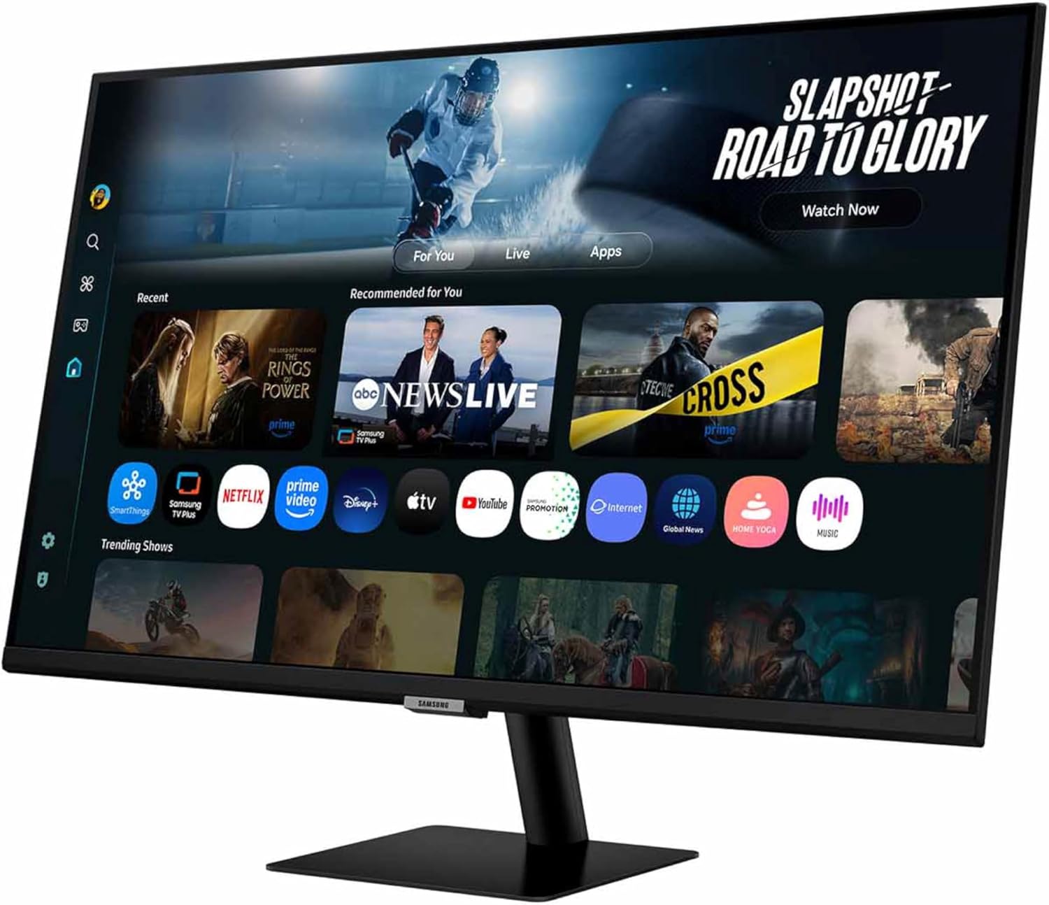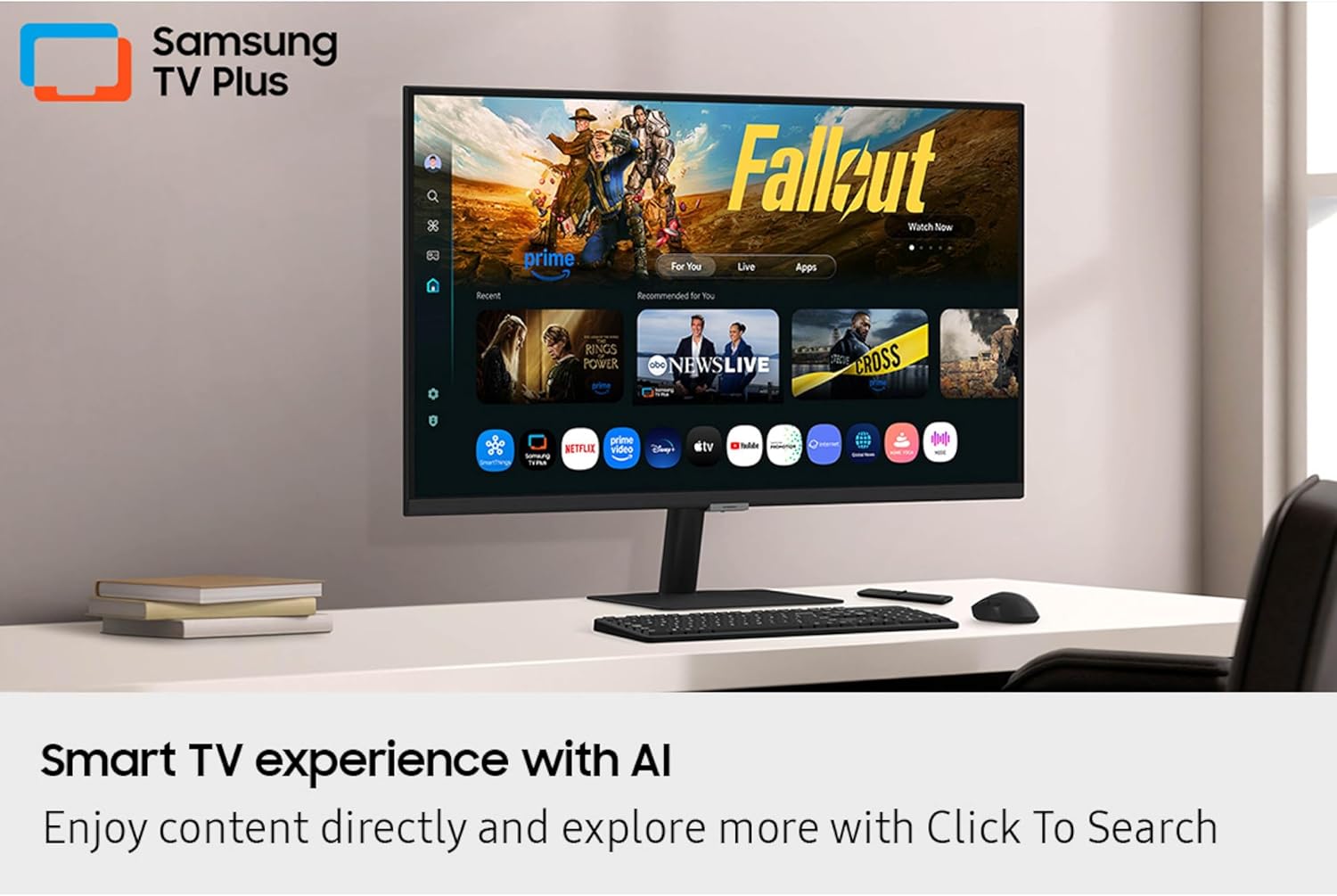 ¹Features, services and app availability may vary by country and region. Samsung TV Plus and Universal Guide may not be available in some regions. Some features may require separate subscriptions. The user interface is subject to change without notice. This Smart Monitor does not include a TV tuner, which is not necessary for streaming apps. Internet connection is required. Remote control specifications vary by country and region. Keyboard and mouse control compatibility varies by app. Access to the full range of smart features, such as network-based services, applications (including games and streaming services), and smart home functionality, requires a Samsung Account. Without logging in, functionality is limited to external devices, e.g. via HDMI. You can sign up for a free Samsung Account at https://account.samsung.com. Terms and conditions apply. ²