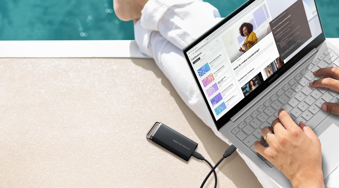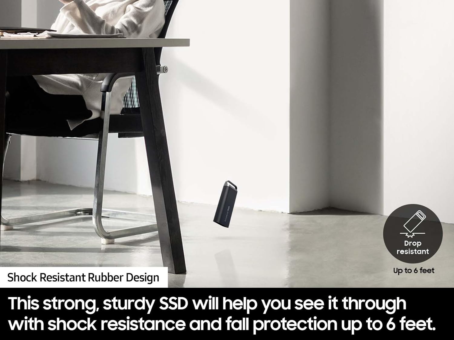 We went big and made it portable. It’s the T5 EVO—an ideal choice for gamers and content creators. This SSD is engineered to handle large file transfers while still small and nimble enough to take along on all your adventures. *Based on a free fall shock test conducted under controlled conditions. **Host device compatibility may vary. ***Source: 2003-2022 OMDIA data: NAND suppliers’ revenue market share.