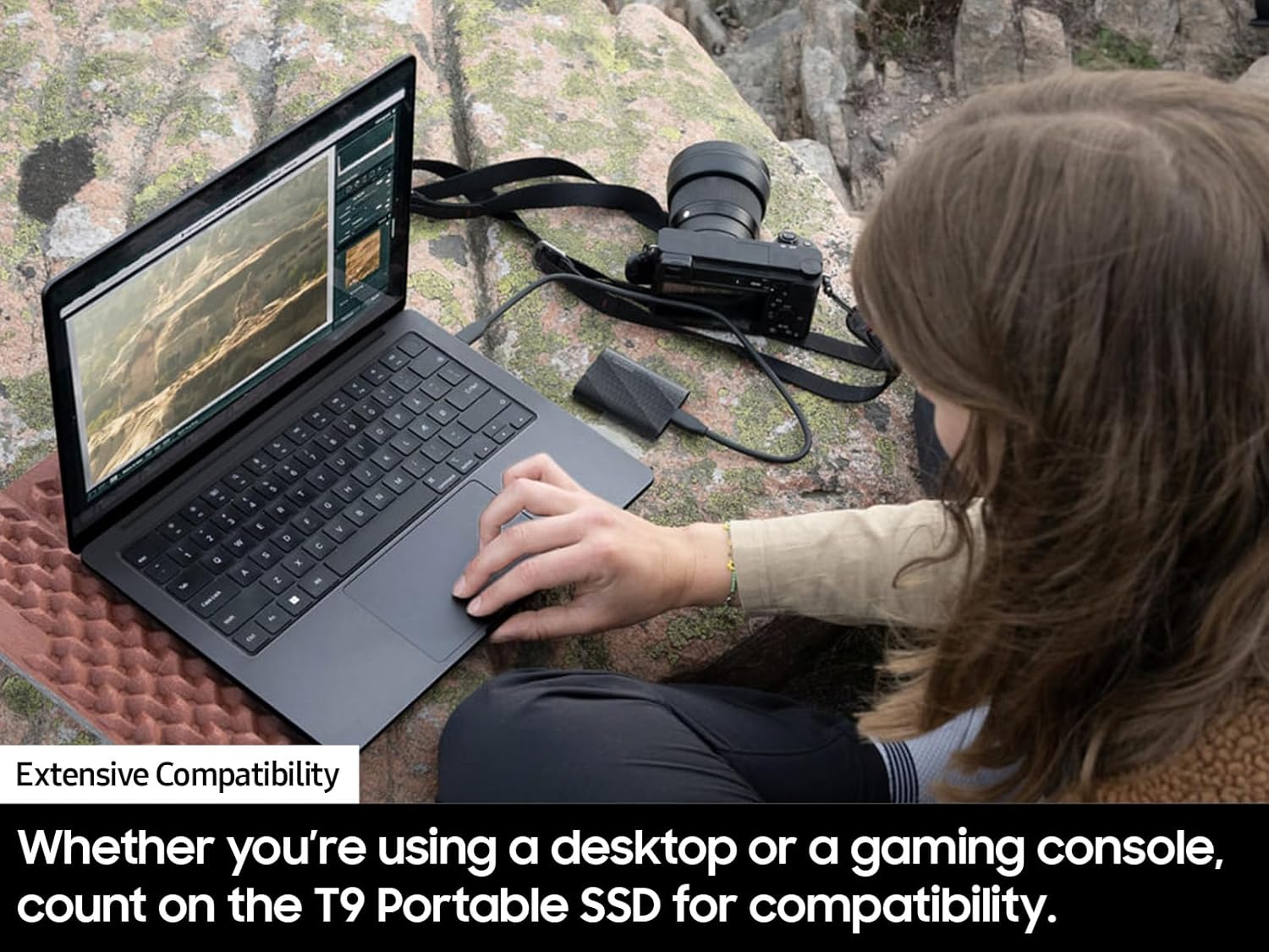 ADAPTS TO EVERY NEED: Whether you’re using a desktop, camera or a gaming console3, count on the T9 Portable SSD for extensive compatibility; It’s a true team player when it comes to heavy-duty application usage or file-saving