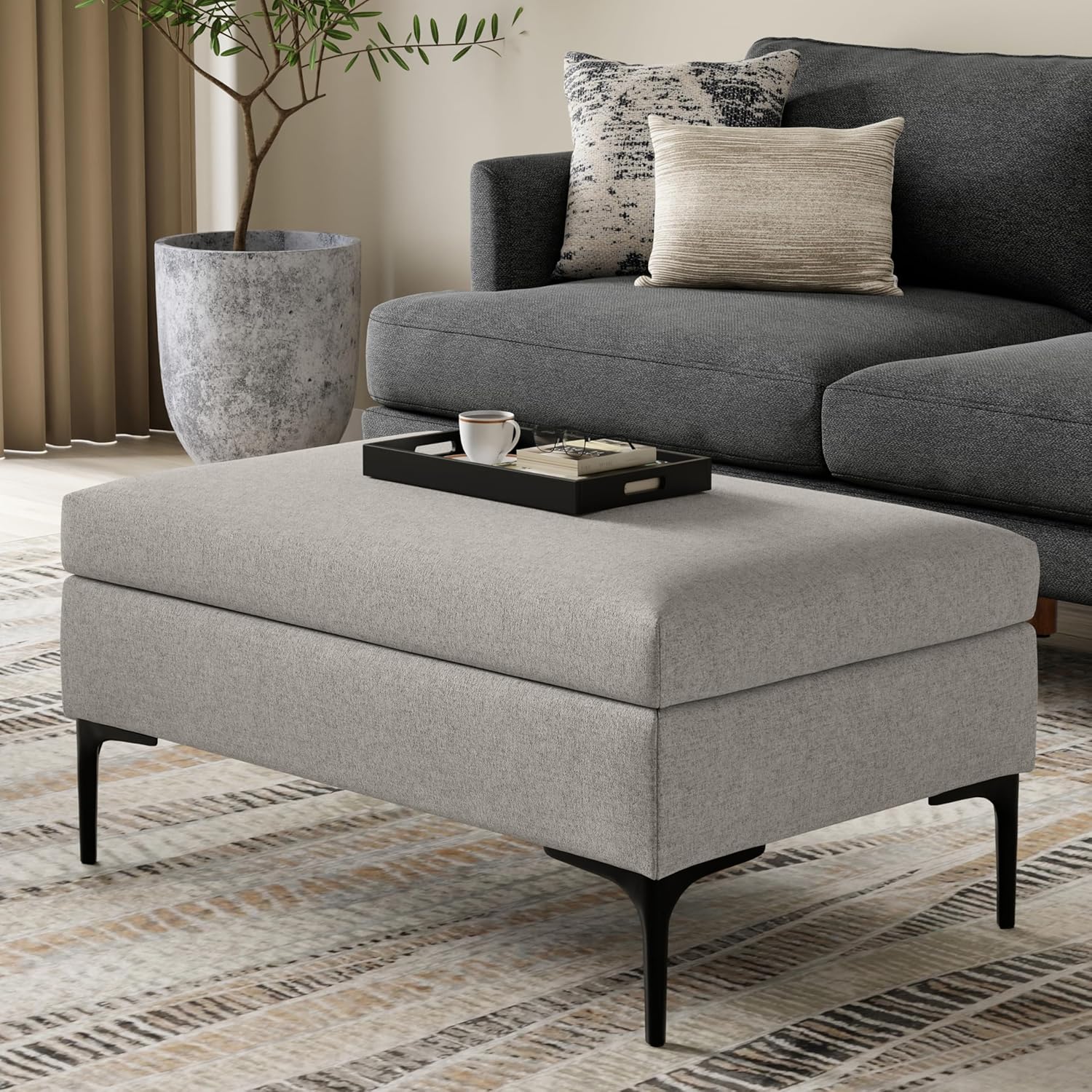 SIMPLIHOME Rebecca 36 inch Wide Mid Century Rectangular Coffee Table Storage Ottoman with Lift Up Lid in Cloud Grey Polyester linen Look, Assembled, For the Living Room, Entryway and Family Room