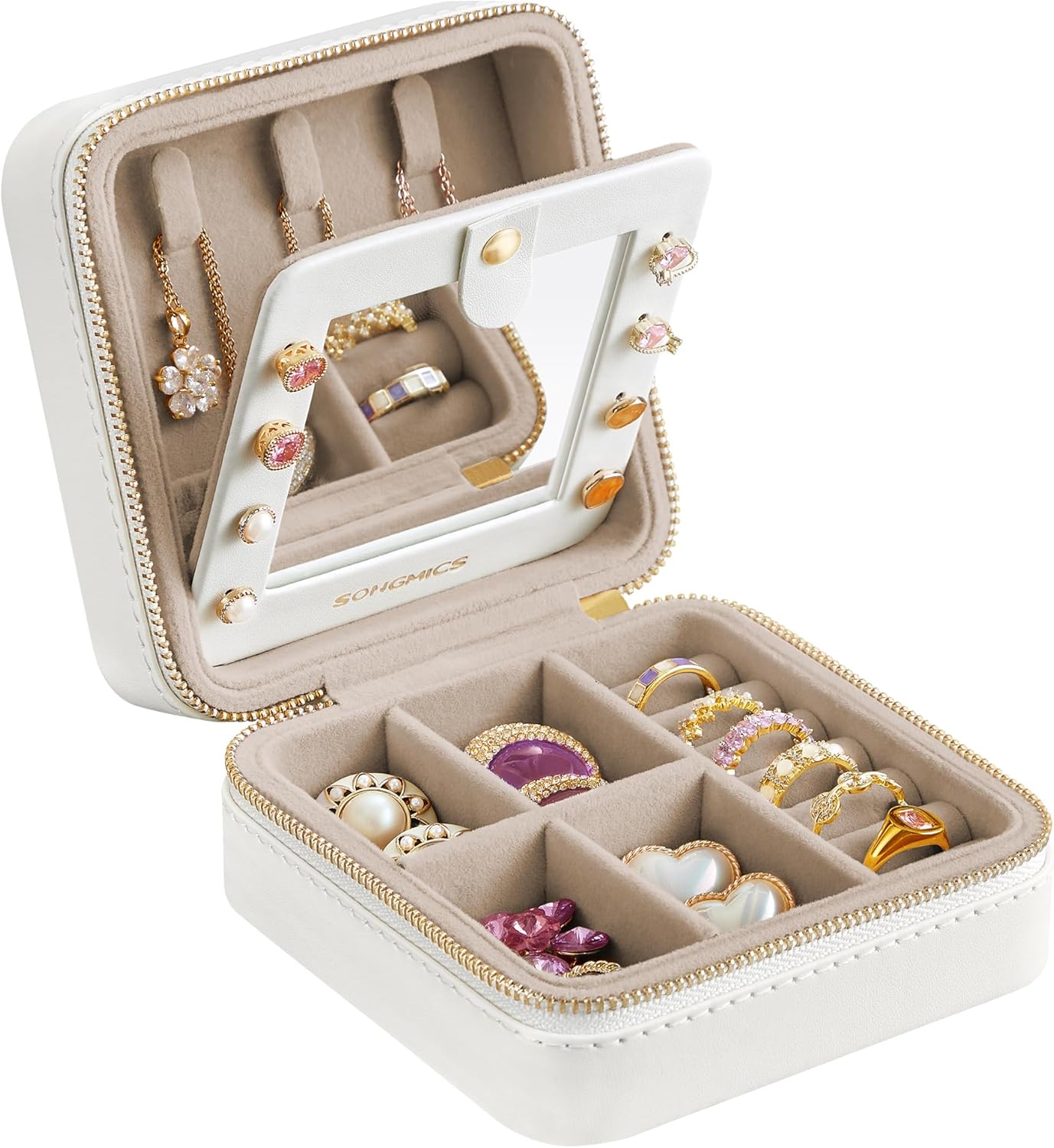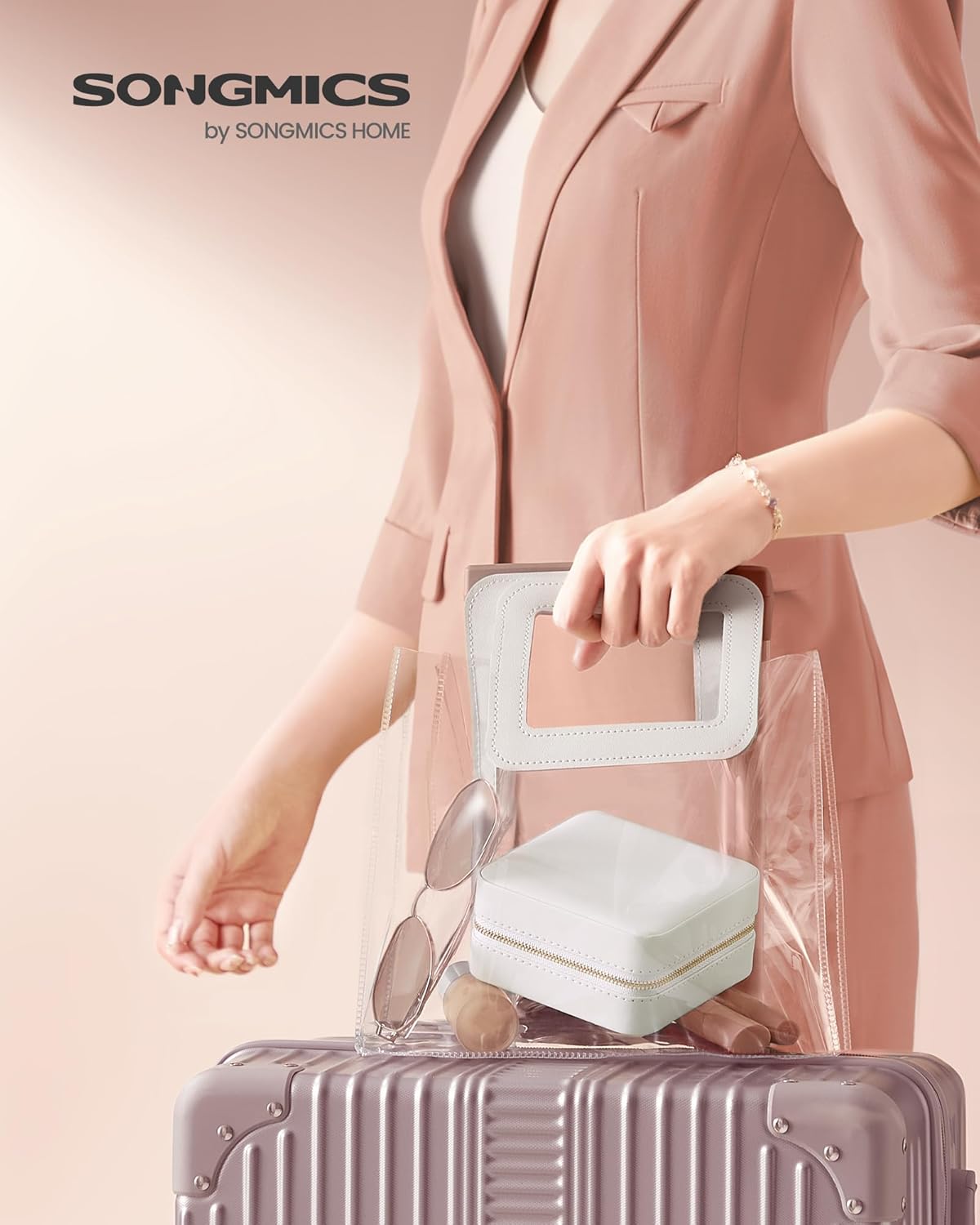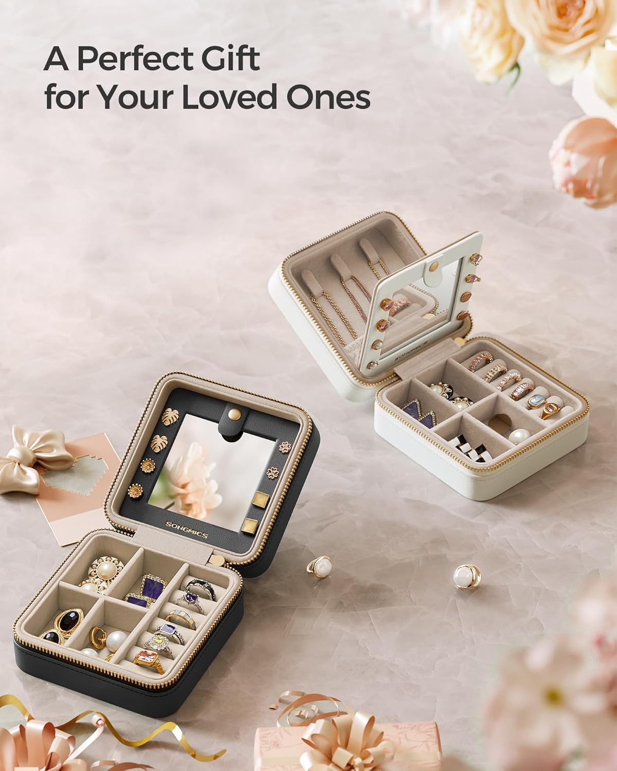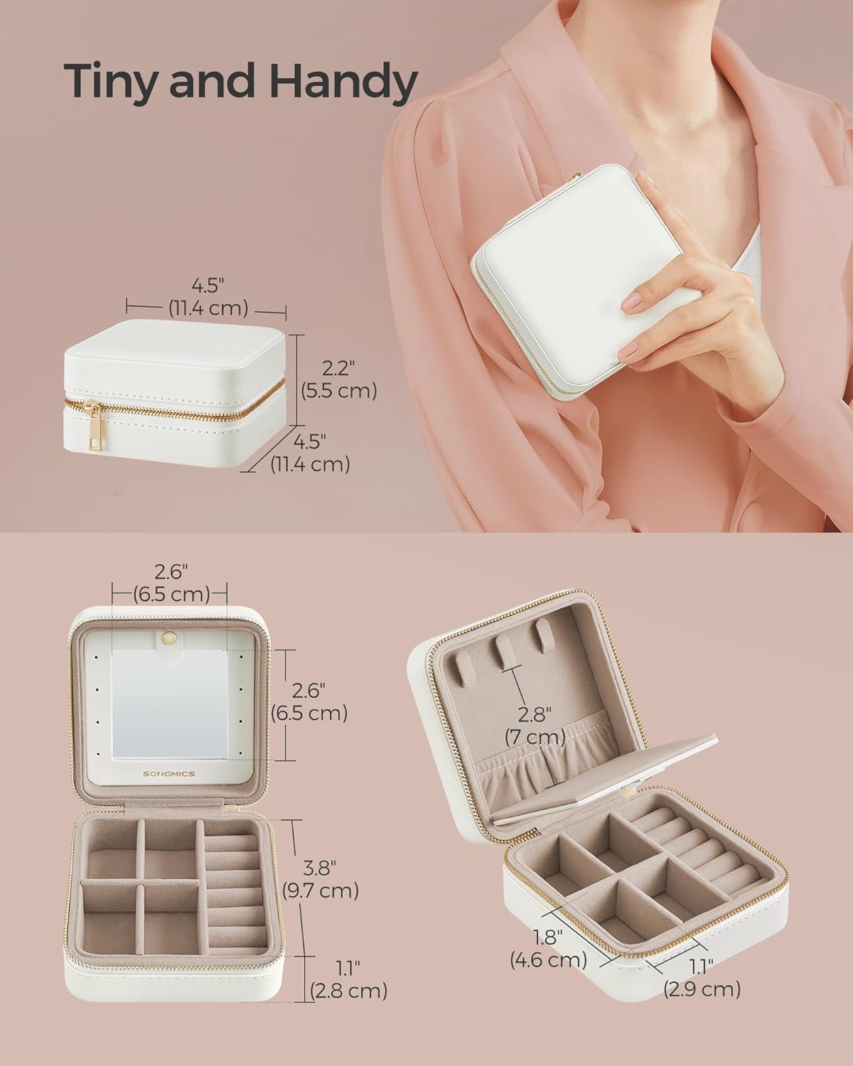 SONGMICS Jewelry Box, 4.5 x 4.5 x 2.2 Inches Travel Jewelry Box with Interior Mirror, PU Leather Jewelry Storage for Women, Small Jewelry Organizer, Portable, Gift Idea, Cloud White UJBC146BEV2