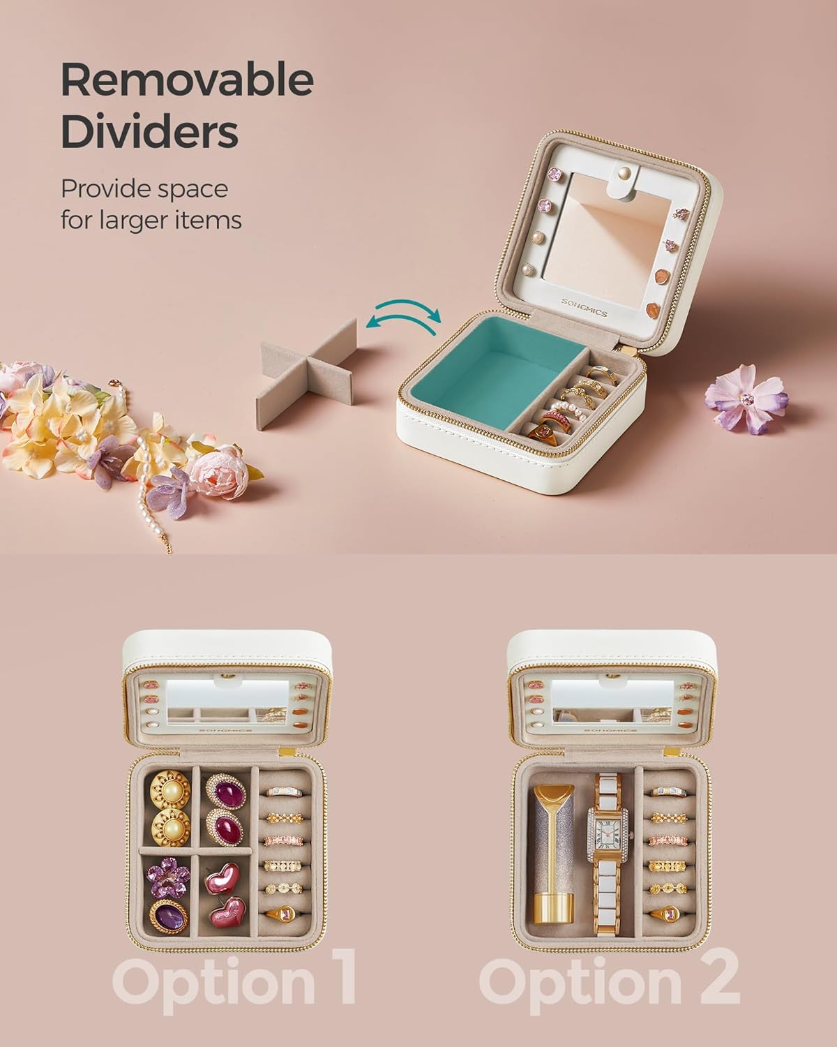 [Interior Mirror & Thoughtful Details] The jewelry case boasts a mirror to check your makeup and jewelry, removable cross-shaped dividers to accommodate larger accessories, and a secure zipper for reliable closure