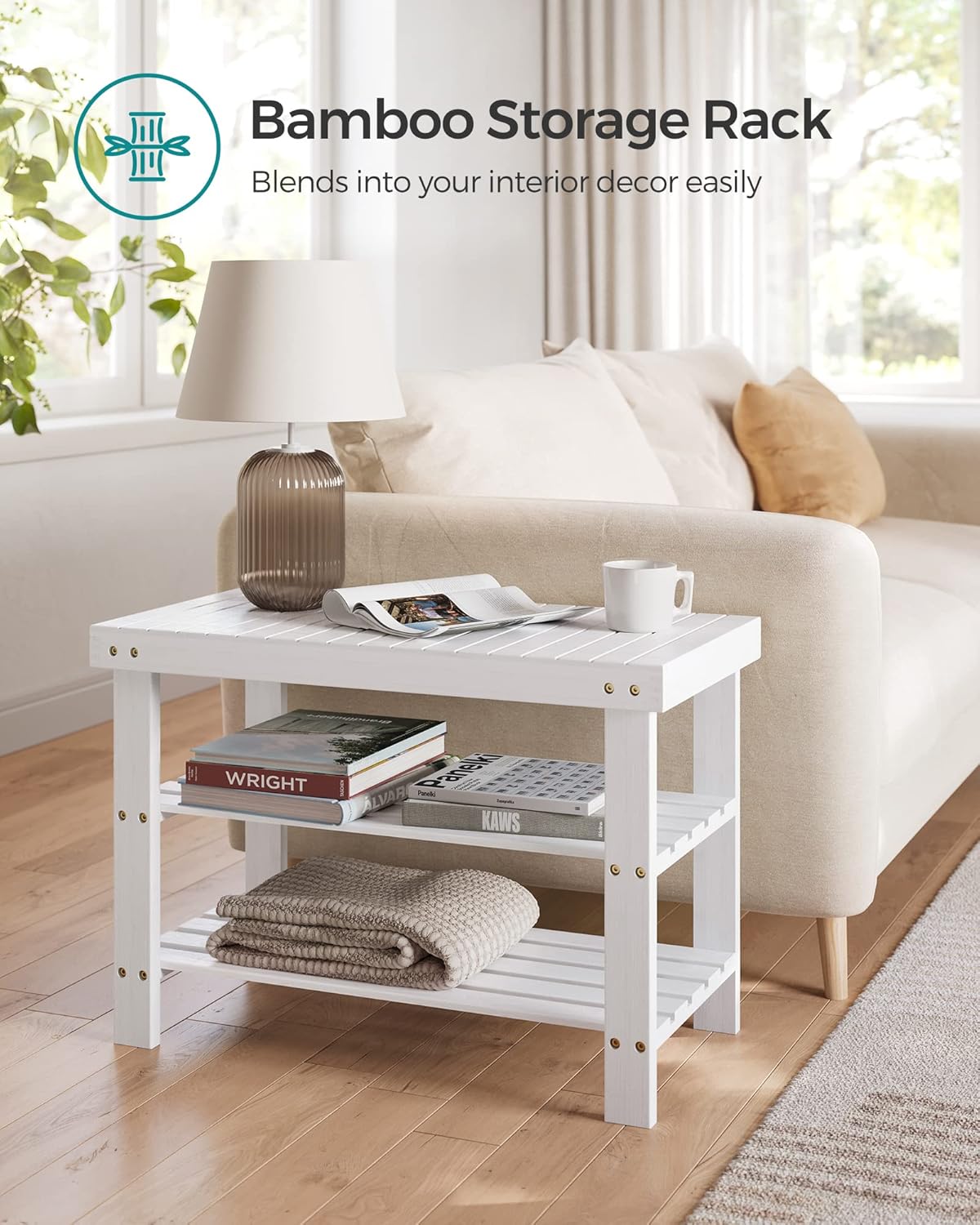 Spacious Storage: 2 roomy shelves keep your shoes organized, while the top shelf is perfect for bags or keys.Versatile Use: Perfect for your living room, bedroom, bathroom, and more.Sturdy Build: Made from premium bamboo, it can support up to 286 lb on the top and 22 lb on each shelf.Modern Design: Its simple yet stylish appearance adds a welcoming and warm feeling to your home.Easy Assembly: Simple structure and clear instructions make it a breeze to set up in minutes.