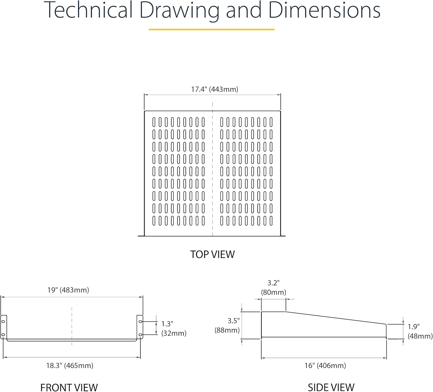 UNIVERSAL 19” FIT: This 2U vented server rack mount shelf is designed to fit virtually any 19in server rack and can accommodate an internal depth of 16in (41cm) for your data, IT, networking, or other non-rack mount equipment