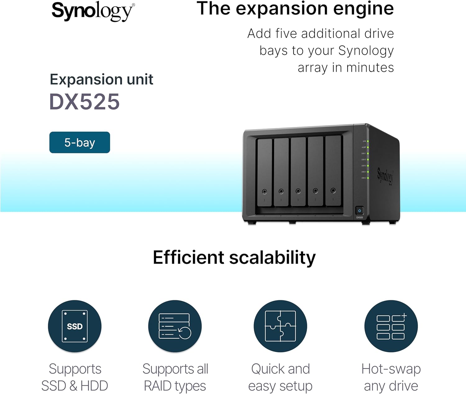 Add 5 additional 3.5″/2.5″ SATA HDD/SSD to your DiskStation.