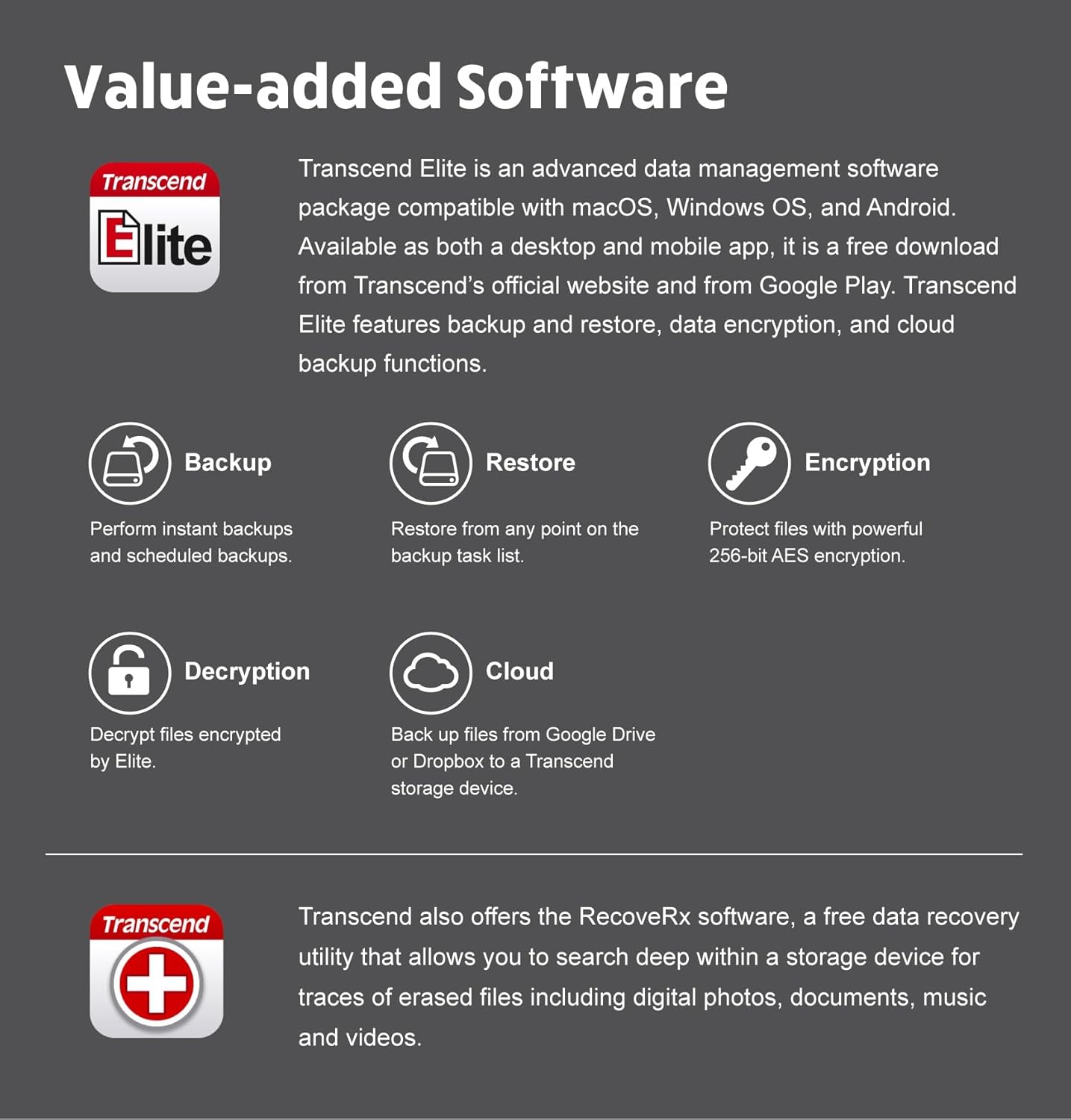 Exclusive Transcend Elite Software: Users can download the Transcend Elite data management software, which offers features like data backup and restoration, data encryption, and cloud backup functions, enhancing data security and management.