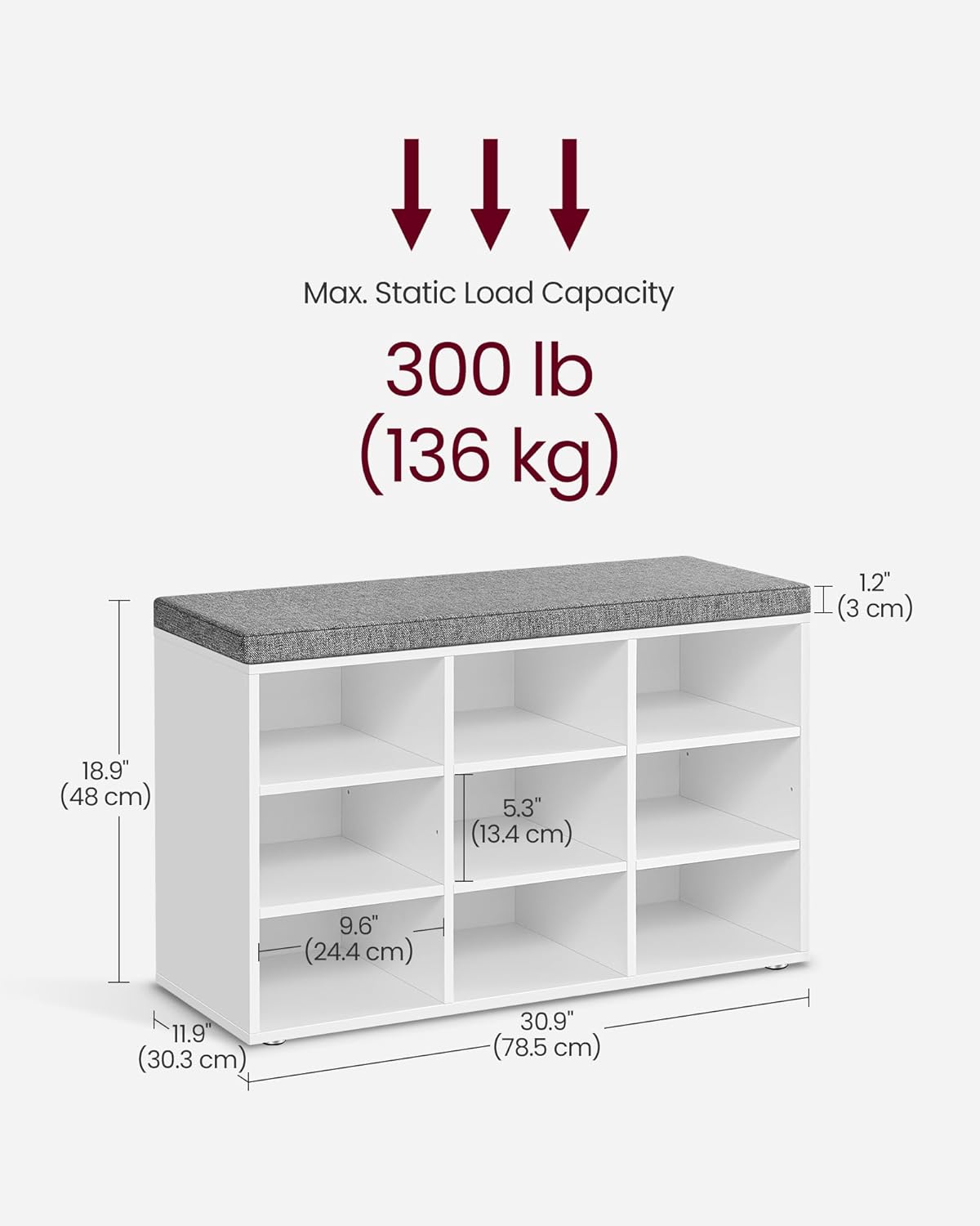 VASAGLE CUSTOS Collection – Shoe Bench, Storage Bench with Padded Seat, Entryway Bench with 9 Compartments, for Bedroom, 11.9 x 30.9 x 18.9 Inches, Cloud White and Dove Gray ULHS009W14