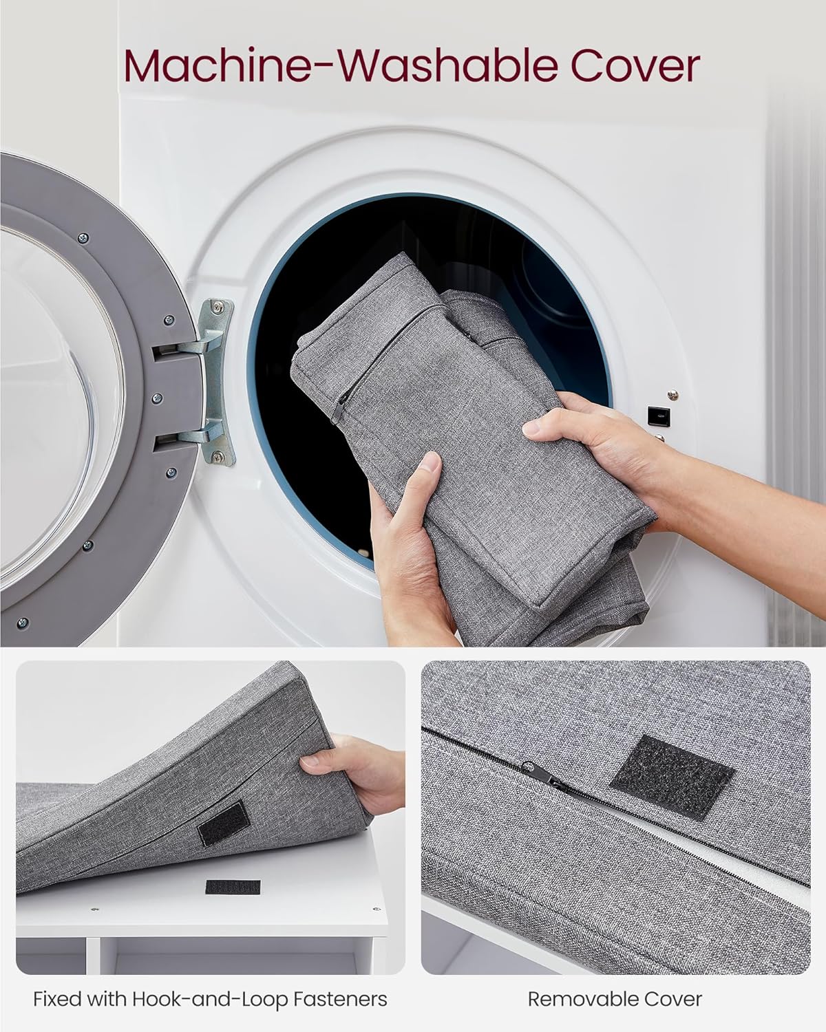 【COMFORTABLE, REMOVABLE CUSHION】The cushion that makes this entryway bench comfortable to sit on is attached by hook-and-loop fasteners for easy removal. Its zippered linen-look fabric cover can be easily detached