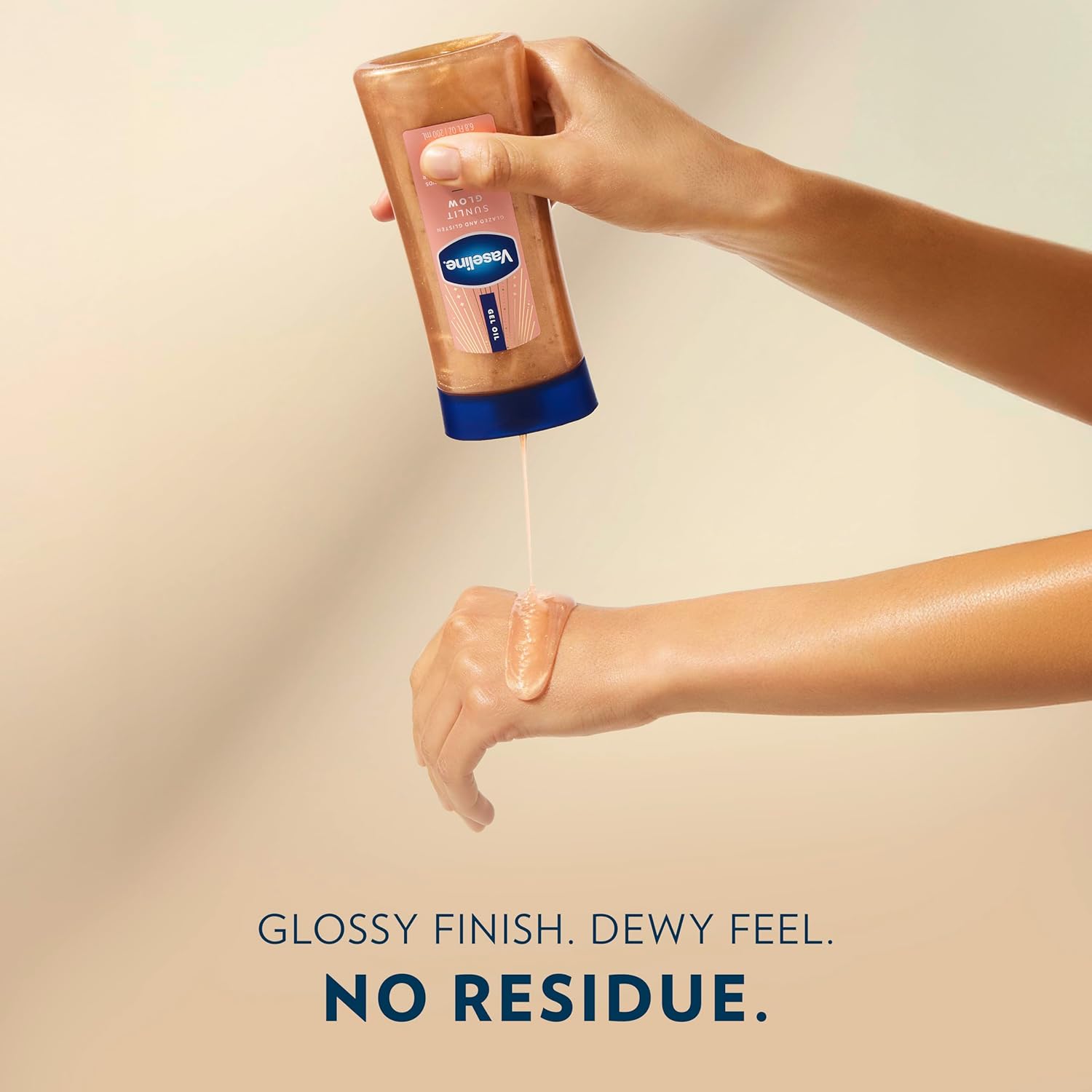 Glow like sunlight on skin with our new Vaseline Glazed & Glisten Shimmering Body Gel Oil —a luxurious, silky oil gel formula that melts into skin, leaving a light-catching, peachy champagne shimmer for a soft, sunlit glow—without tinting the skin. Transport your senses with an addictive fragrance blend of warm vanilla and toasted cocoa butter — enveloping skin in a glow and scent that lingers like soft daylight and sunshine on skin. It’s summer in a bottle. This lightweight, shimmering body oil glides on with a sheer, peachy glaze and dewy, glossy finish that absorbs quickly—no sticky residue, just transfer-resistant glow that catches the light. Powered by beauty from skin science, this body oil for dry skin is infused with skin-loving ingredients like ultra-hydrating lipids and 100% pure cocoa butter to help strengthen the skin barrier and lock in moisture—revealing visibly smooth, glowing skin that stays hydrated and looks as good as it feels. Designed with light-reflecting shimmer, this peachy golden-pink glow flatters all skin tones and skin types—delivering a lit-from-within radiance that enhances your natural beauty and leaves you glowing with confidence. Massage oil onto shoulders, collarbones, arms, and legs for radiant skin that catches light wherever the day takes you. Skincare meets self-care when you layer body oil after shower or bath with your favorite body lotion to lock in hydration, glow, and scent that lasts. From sunlit mornings and poolside lounging to desk-to-dusk days and soothing self-care evenings, this is your new glow-to essential from AM to PM.