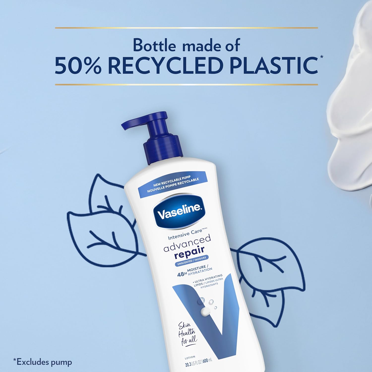 Made with Vaseline Jelly and Ultra-Hydrating Lipids, Vaseline Intensive Care Advanced Repair Unscented Body Lotion for dry skin prevents dryness and helps keep your skin looking healthy and hydrated. With daily exposure to environmental triggers (like wind, lack of humidity, and sun), skin’s natural moisture barrier can break down, allowing water to escape the skin. But the Ultra-Hydrating Lipids in our Advanced Repair Lotion fortify the skin barrier and replenish moisture to allow the skin’s natural barrier to recover. Vaseline Intensive Care Advanced Repair Unscented Lotion, formulated with Ultra-Hydrating Lipids and Vaseline Jelly, locks in moisture and repairs extremely dry skin. This unscented body moisturizer is clinically tested to provide 90% more moisture (vs. untreated skin). This lotion for dry skin absorbs fast for rich moisturization without feeling greasy and provides 48-hour moisture. Use this dermatologist-tested body lotion daily on dry, rough skin for stronger, noticeably healthier skin. Just apply to your skin for long-lasting moisture. This lotion bottle is made of 50% recycled plastic. Our ambition is to get to 100% recycled plastic in the near future. Since 2018, we’ve used 337 Metric Tons of recycled plastic across the Vaseline product portfolio in North America.