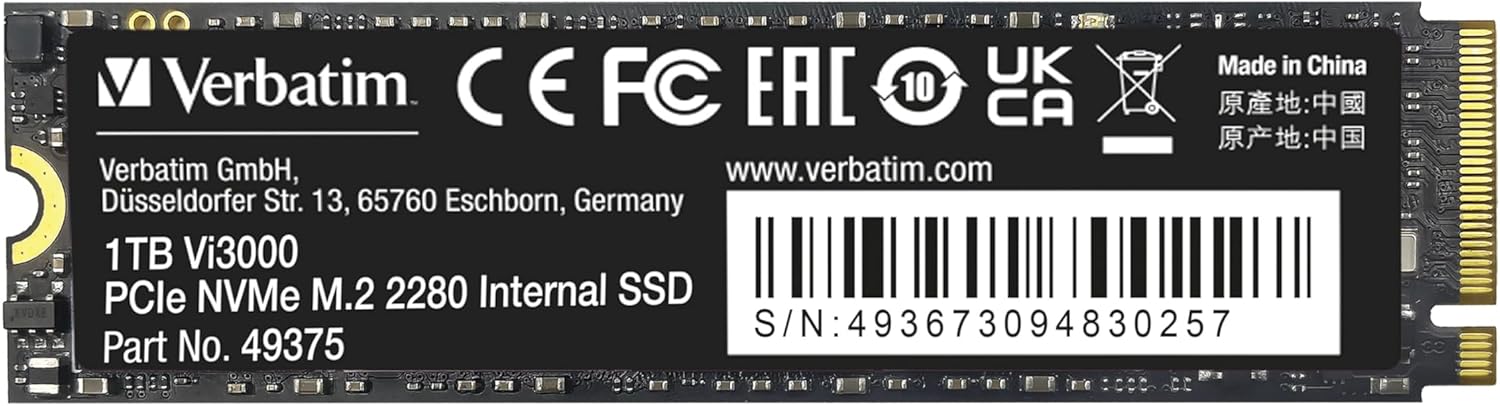 Verbatim 1TB SSD Vi3000 Internal Solid State Hard Drive PCIe NVMe M.2 2280