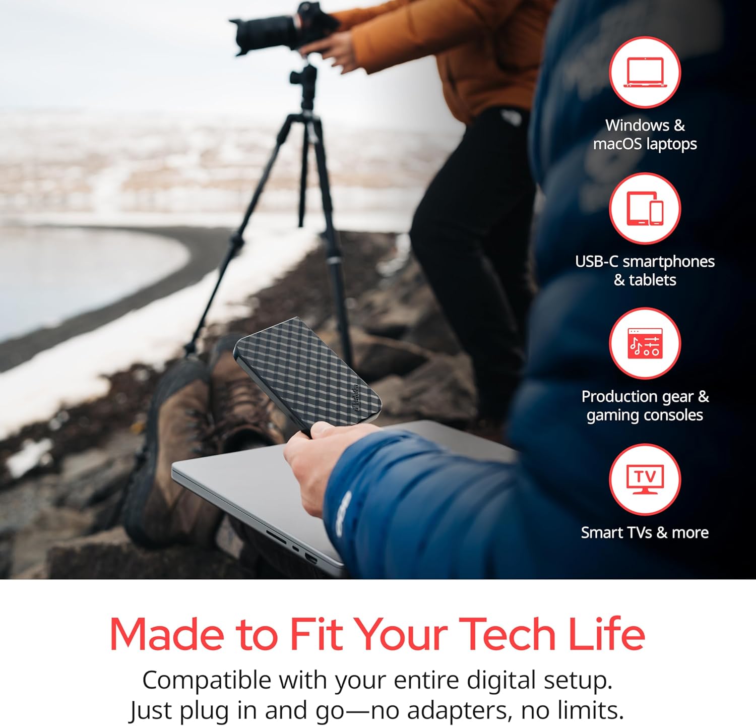 Stylish black design with a 3D surface; USB-C to USB-A cable, USB-A to USB-C adapter, Quick Start Guide and User Manual included