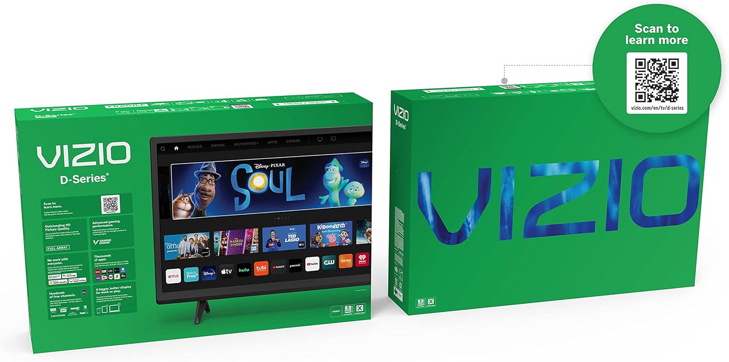 Versatility and performance collide with the new D-Series FHD Smart TV that comes loaded with a full array backlight for better contrast and uniformity, brilliant 1080p Full HD resolution and an ultra-fast VIZIO IQ processor with support for immersive audio pass-through for Dolby Atmos and DTS:X. Game on with the V-Gaming Engine that enables next-level gaming performance with features like Variable Refresh Rate with AMD FreeSync, auto game mode, low-latency gaming, and newly added gaming menu. D-Series blends power, speed and versatile size. Stream it all with the award-winning SmartCast platform loaded with the best selection of built-in apps including WatchFree+ that lets you enjoy free access to live TV and hundreds of free channels right out of the box. SmartCast also works with Apple AirPlay 2 and Chromecast built-in, offering unparalleled entertainment in a size that fits your lifestyle.
