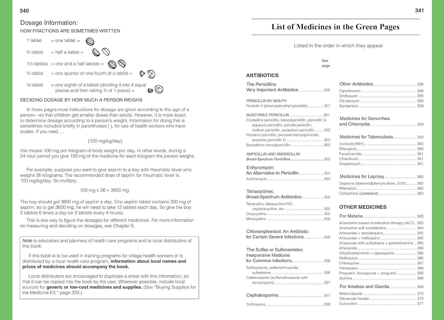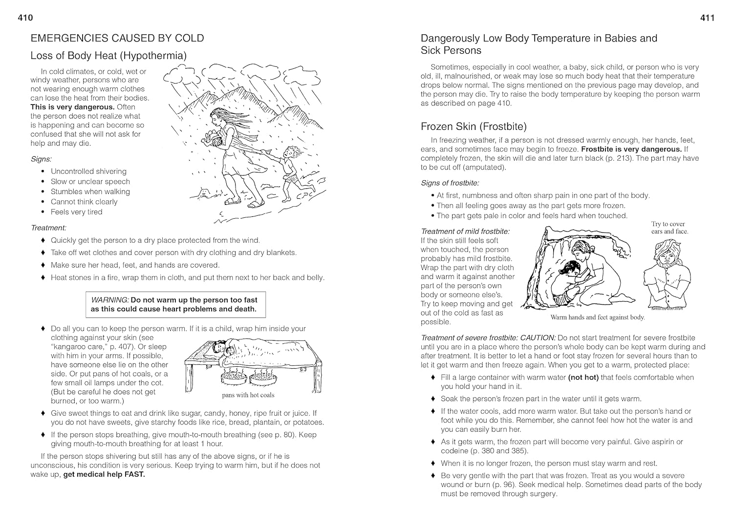 examining and caring for sick people – how to check breathing, pulse, and temperature; identifying diseases based on fever patterns, watching for signs of dangerous illnesses, and when to go for medical helpidentifying and treating illnesses – recognizing common sicknesses including dehydration, cold and flu, asthma, allergic reactions, arthritis, and back pain, as well as serious illnesses like malaria, tuberculosis, tetanus, dengue, and typhoid feversanitation and disease prevention – promoting good hygiene, step-by-step instructions to build a basic latrine, and prevention and treatment of intestinal parasites and wormsfirst aid and wilderness medicine – how to treat minor injuries like small and large cuts and minor burns, and more serious injuries and conditions like drowning, broken bones, bullet or knife wounds, snakebites, and shockpregnancy and sexual health – staying healthy during pregnancy, preparing for birth, and delivering a baby; birth control methods; identifying, treating, and preventing sexually transmitted infections like HIV and syphilismedicines and home remedies – how and when to use medicines, how to tell if a home remedy is helpful or harmful, and an easy-to-reference index of medicines with uses, dosages, and precautions