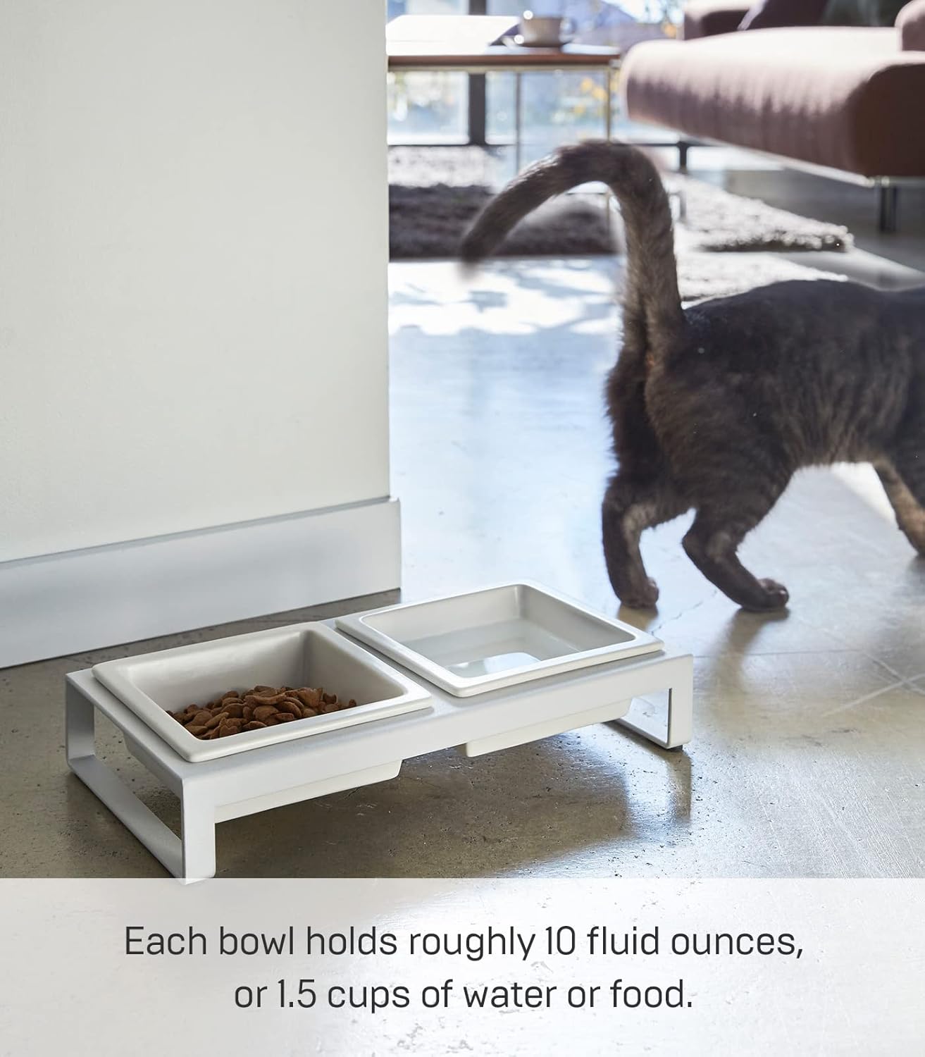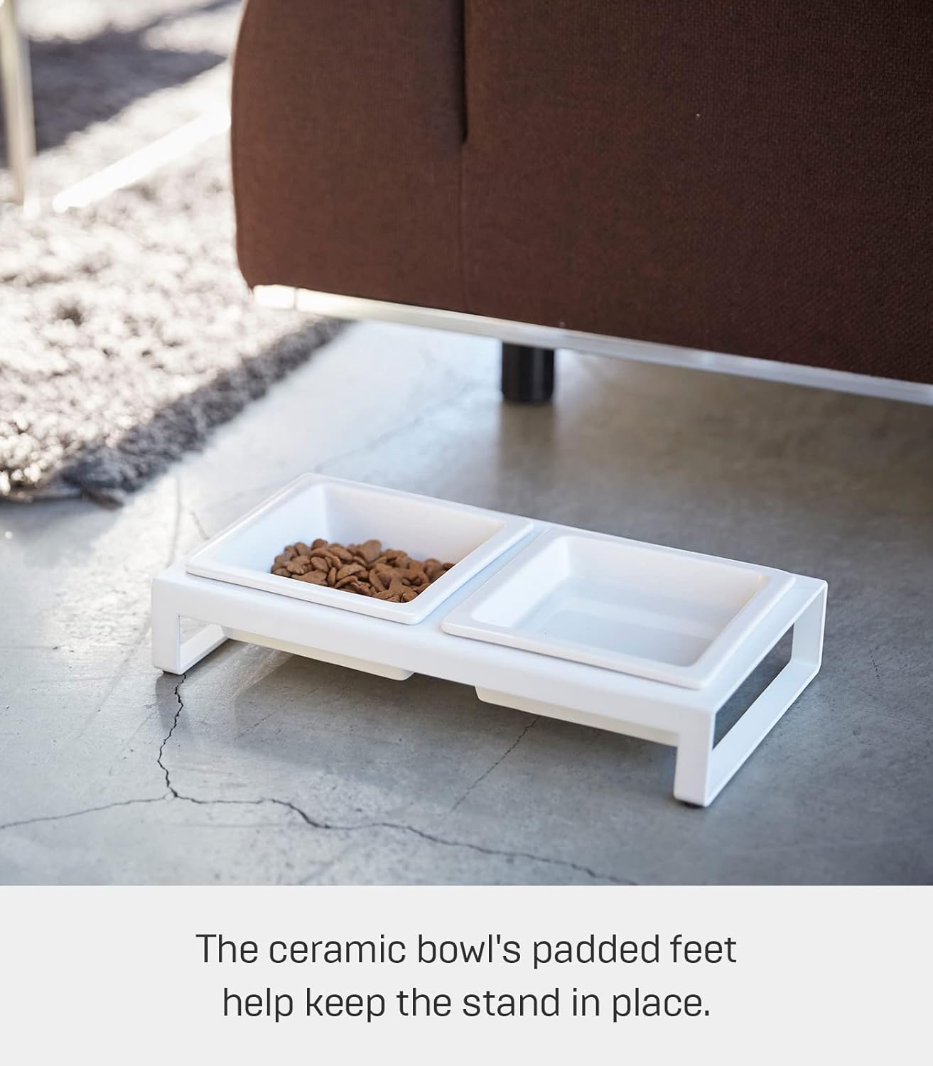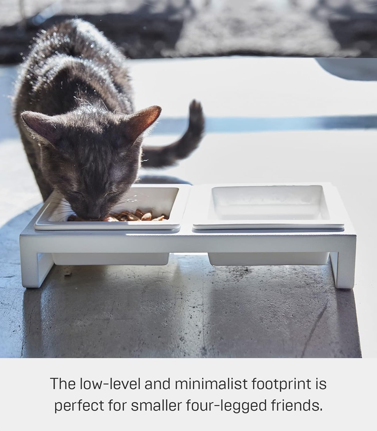 Add a little sophistication to your favorite little feline or canine’s meal times. The ceramic bowls nestle snuggly into the metal frame and the padded feet help keep the stand in place. The low-level and minimalist footprint is perfect for smaller four-legged friends in the home.