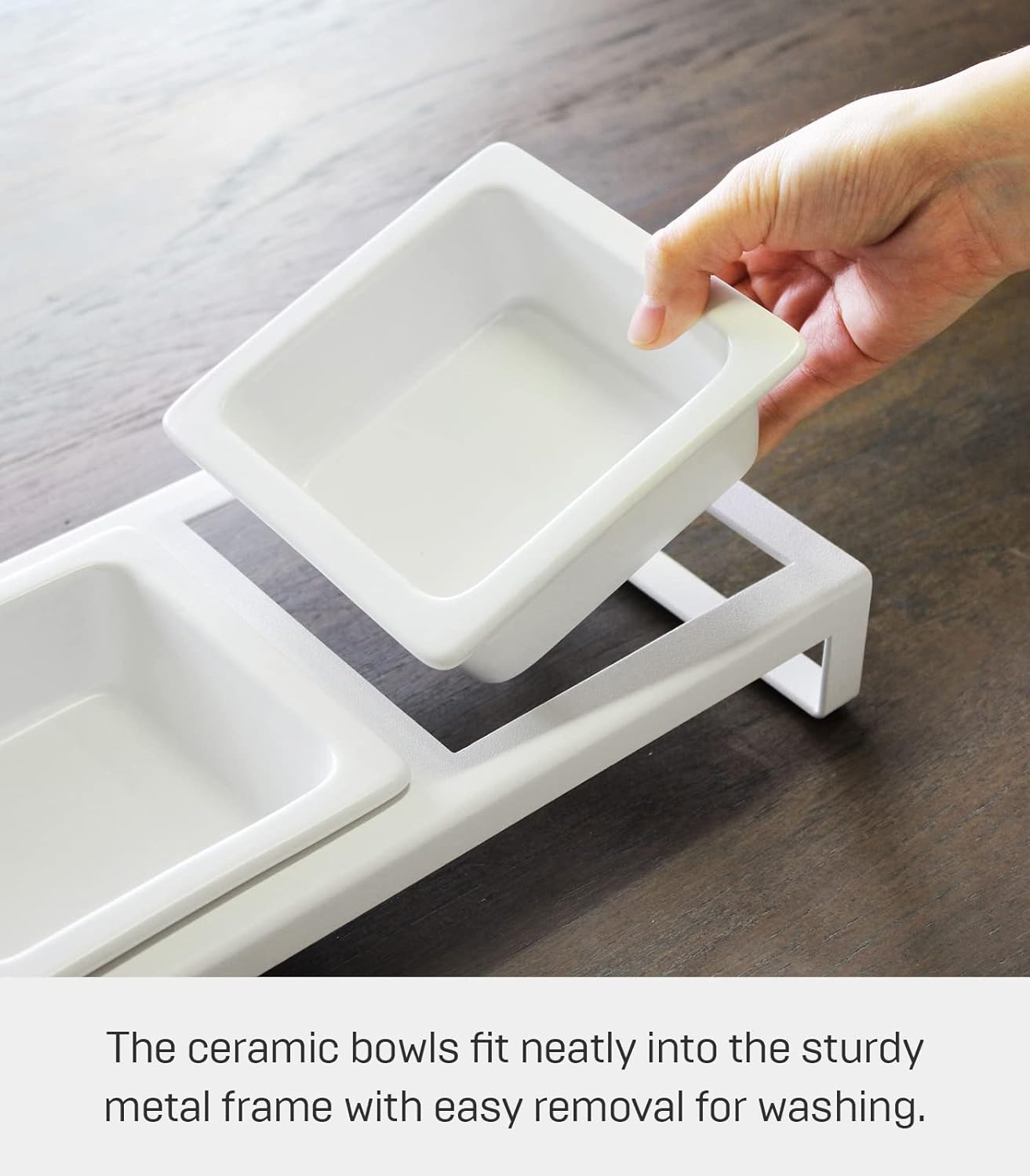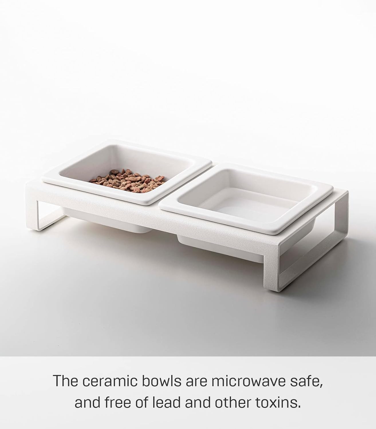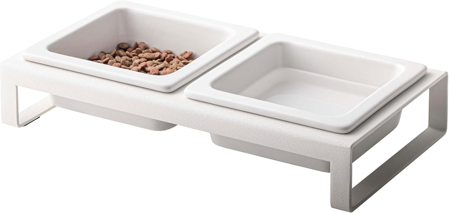 Yamazaki Home Tower Steel and Ceramic Pet Food Stand | 2 Bowls for Food and Water | Feeder for Small Cats and Dogs | Non-Slip – Short – 1.25 Cups, 300 Milliliters Per Bowl, White