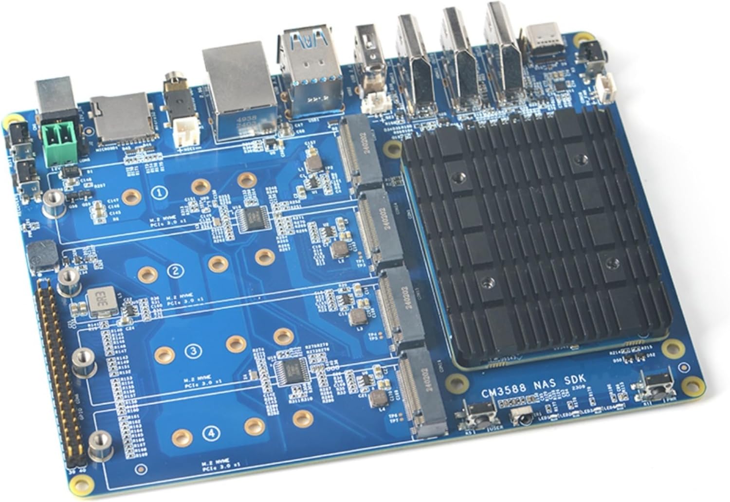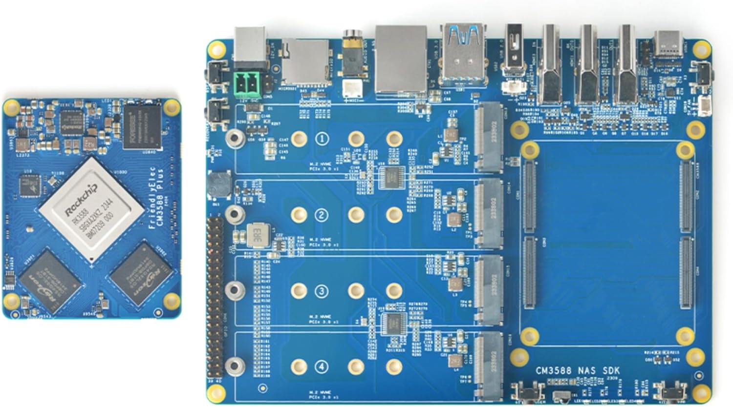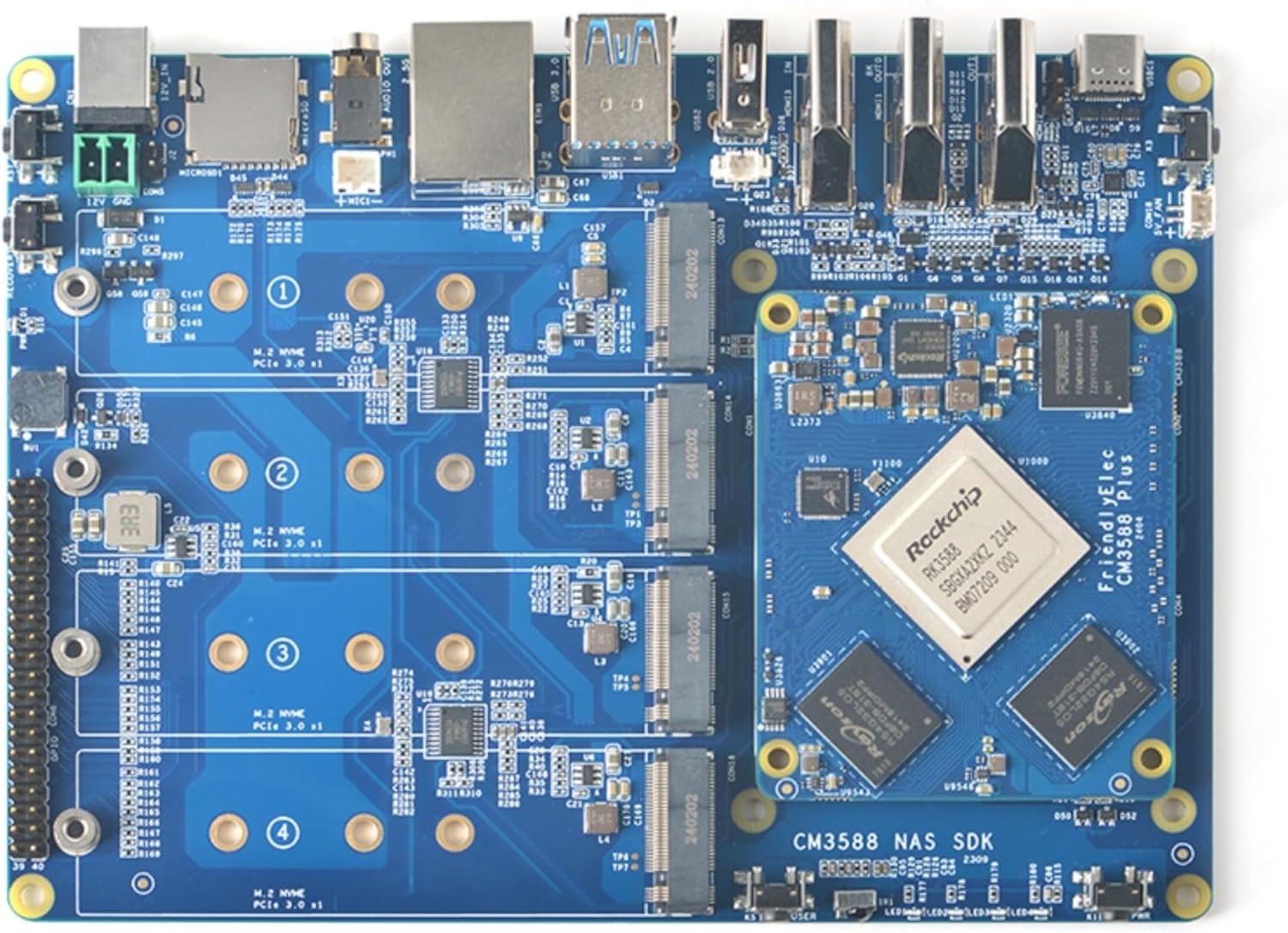 The CM3588 NAS Kit is a carrier board designed based on the https://wiki.friendlyelec.com/wiki/index.php/CM3588 core module. It includes 4x M.2 Key M PCIe 3.0 x1 slots, 2x USB3.0 Type-A ports, 1x USB3.0 Type-C interface with DP support, dual HDMI OUT ports, and one HDMI IN port, and a 2.5Gbps Ethernet interface.
