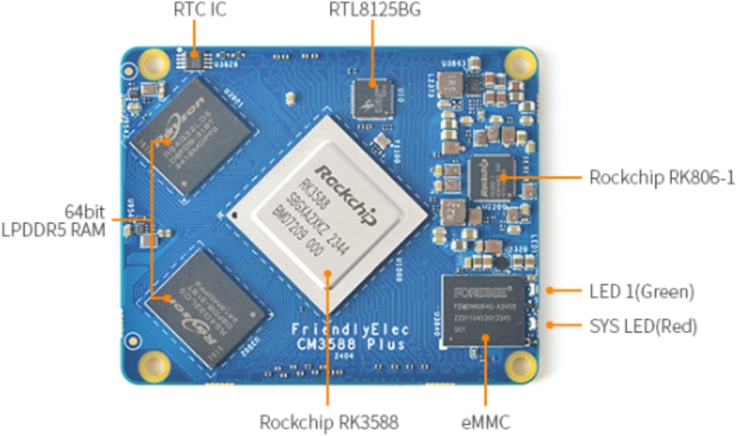 The CM3588 Plus is a high-performance ARM computer module developed by FriendlyElec, designed to deliver advanced computational capabilities for various applications. The Rockchip RK3588 processor powers it. The module comes with a generous amount of memory, featuring either 16GB or 32GB of LPDDR5 RAM and it includes storage options of 64GB or 256GB eMMC flash.